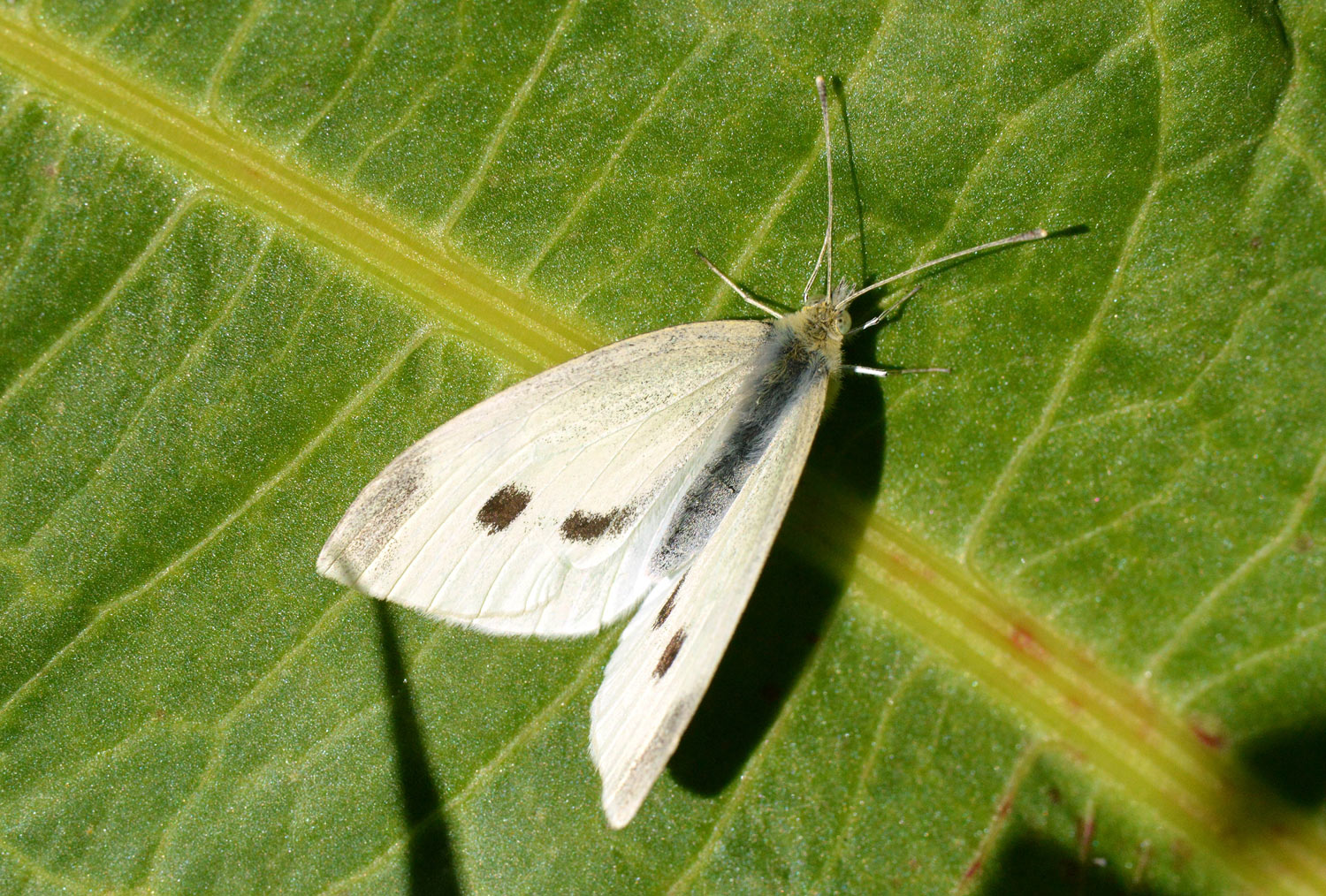 Respecto a los adultos, en las dos primeras imágenes se puede ver una hembra. Hay que apuntar que la mariposa blanca de la col tiene una especie muy parecida que es aún más habitual. Se trata de la mariposa blanquita de la col (Pieris rapae), con una envergadura alar de 40-50 mm. Se dice que es la especie diurna más frecuente [1]. En la imagen número 3, se puede ver una hembra de esta otra especie.