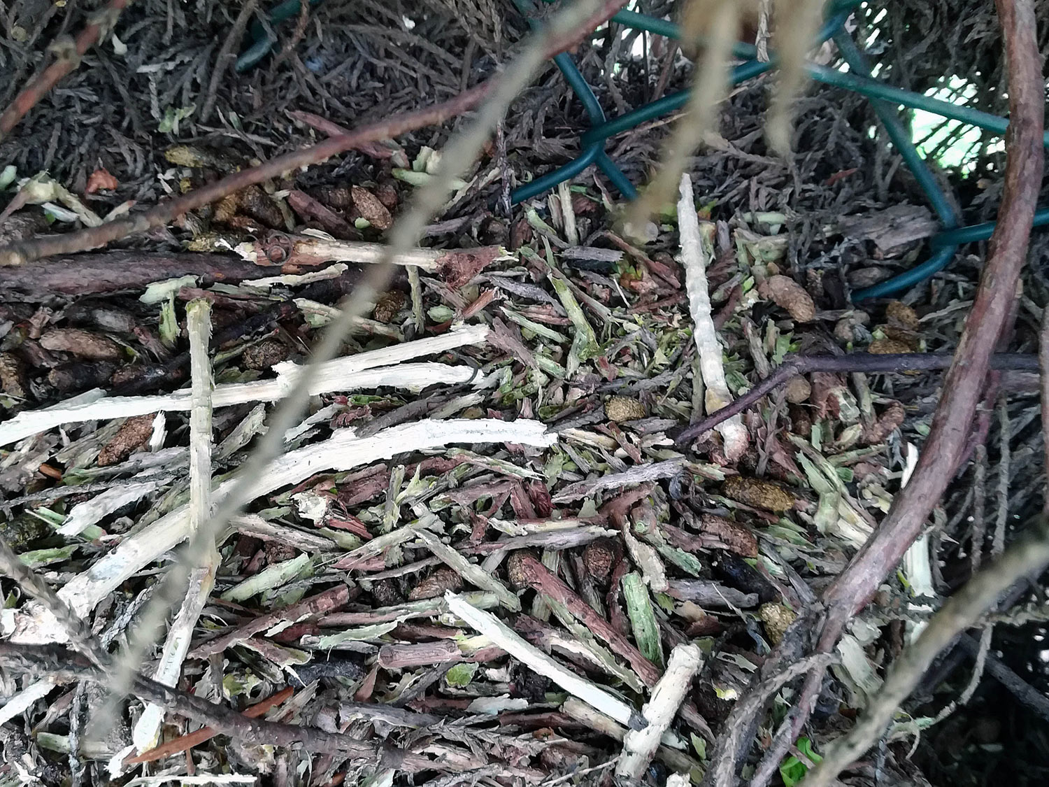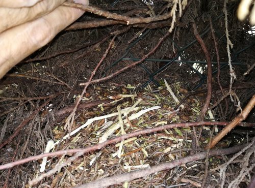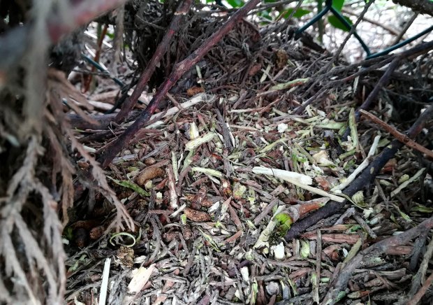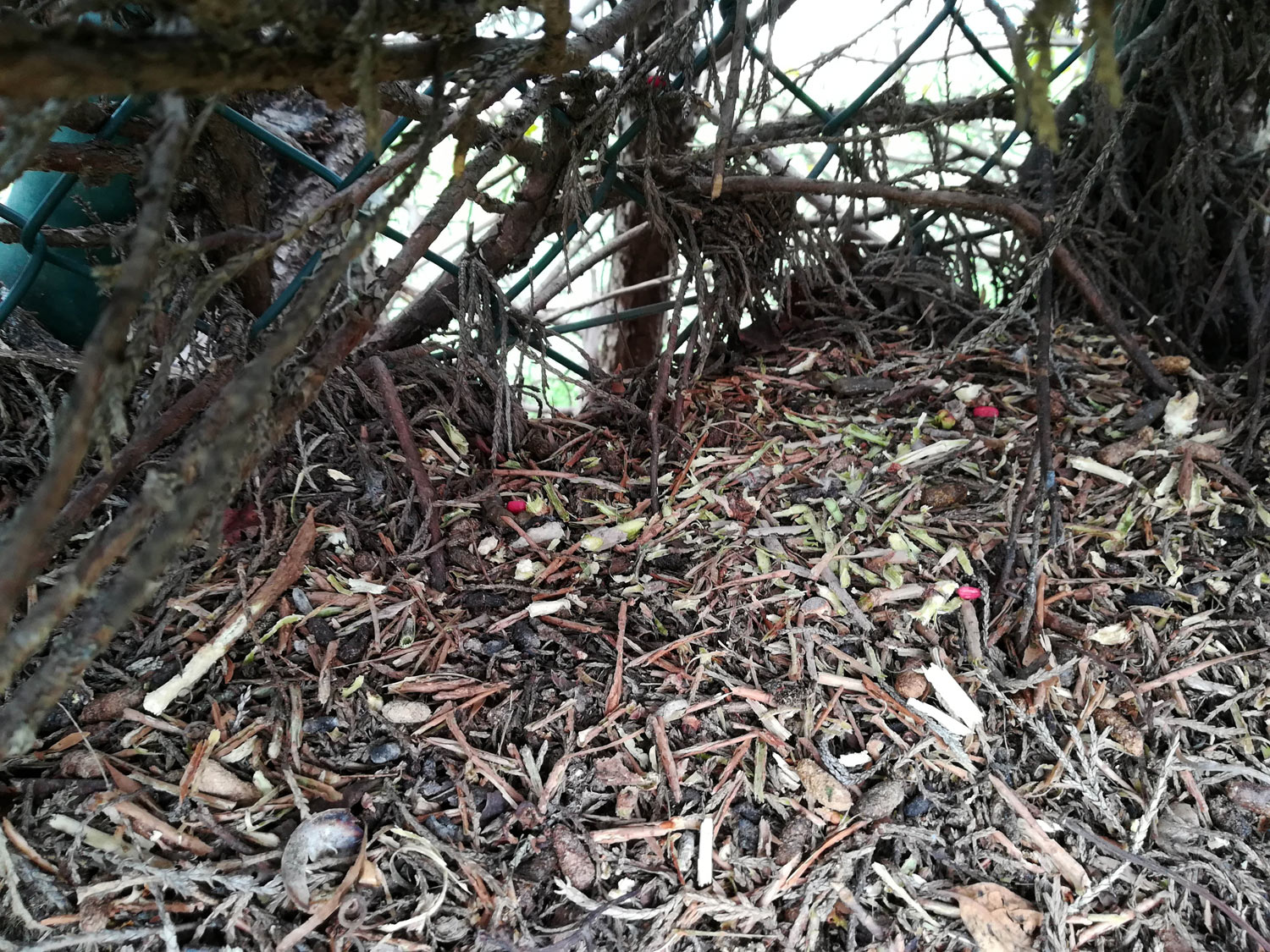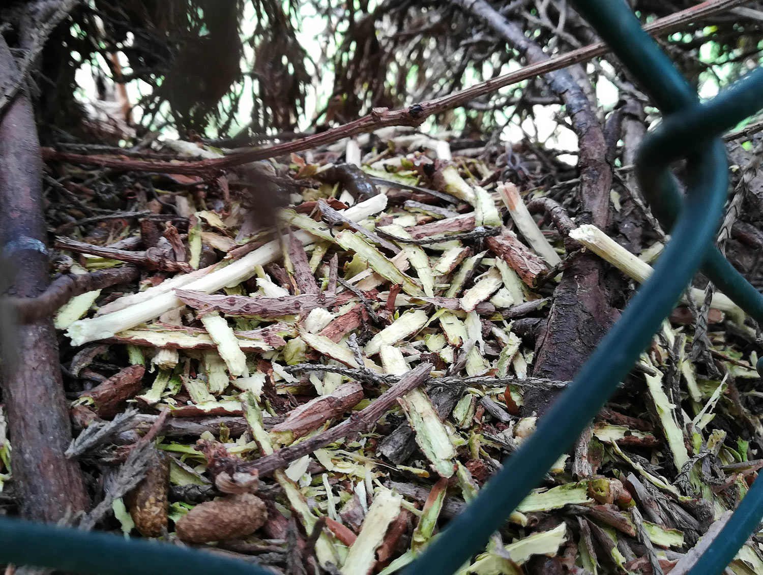 No voy a dar muchos detalles. Tan solo, explicar las fotografías con las que ilustro el caso. Y que cada cual saque sus conclusiones. Veamos. En la imagen número 1, se puede ver un seto formado por tuyas (Thuja). Se trata de una cupresácea muy utilizada para delimitar espacios mediante una cubierta vegetal. Este seto delimita una propiedad particular (vivienda y jardín) que se encuentra rodeada por un par de solares grandes pendientes de urbanizar. Hace un par de años, las tuyas sufrieron un percance y se secaron. Y esto ha permitido aflorar una problemática. Una parte del seto tiene un buen espesor y ha permitido que Rattus rattus anidara en la zona alta. Por otra parte, las ratas comen unos metros más lejos de donde duermen. Su costumbre ha convertido unos puntos del seto en comederos (figuras 2 a 5). Las ratas bajan a buscar comida y parece que, principalmente, comen en estos puntos donde se encuentran seguras. Así pues, observando lo que hay en los comederos se puede ver de qué se alimentan (figuras 6 a 9). Y esto es importante porque los excrementos no son de color negro como suelen ser, sino de color marrón (figuras 10 a 12).