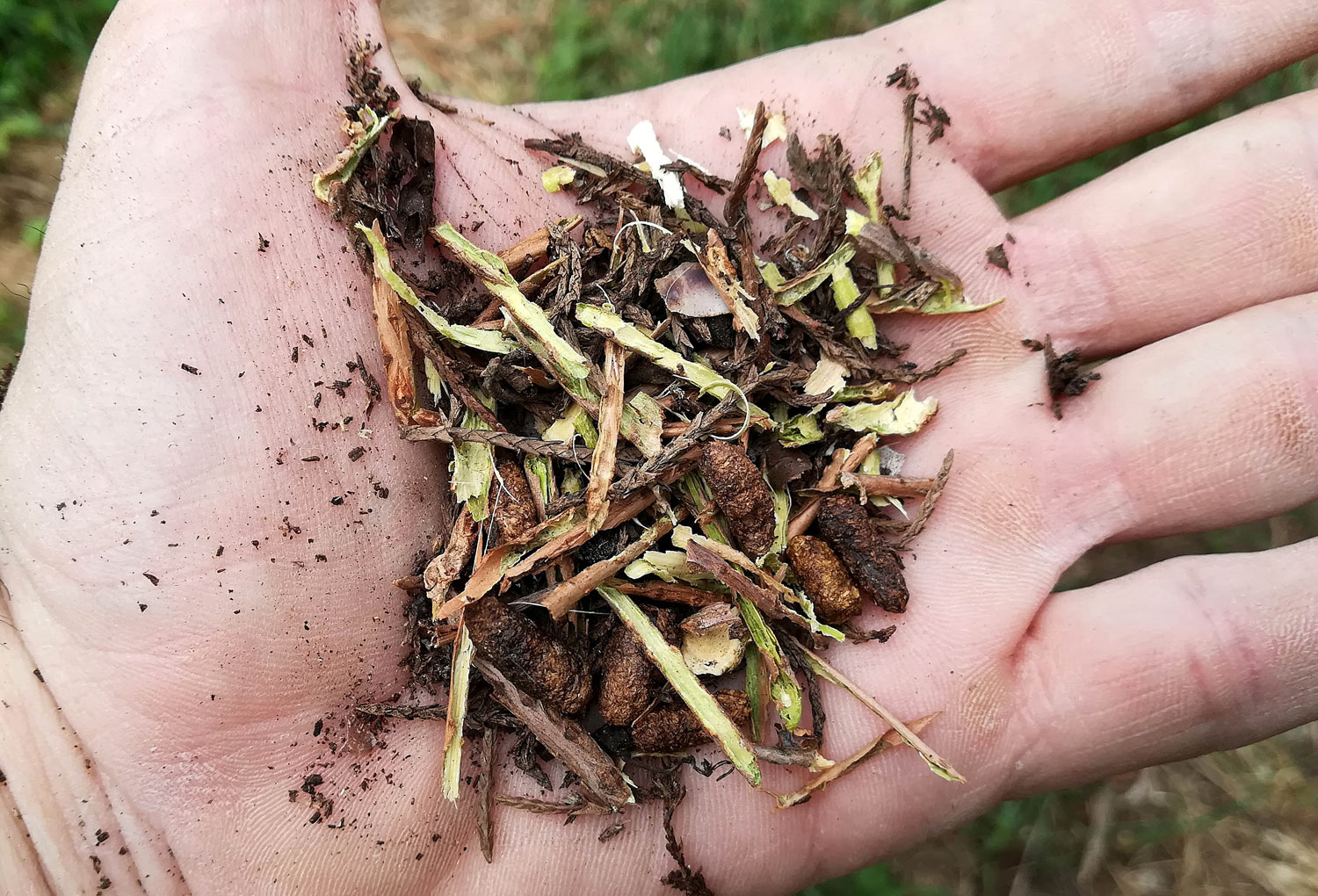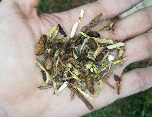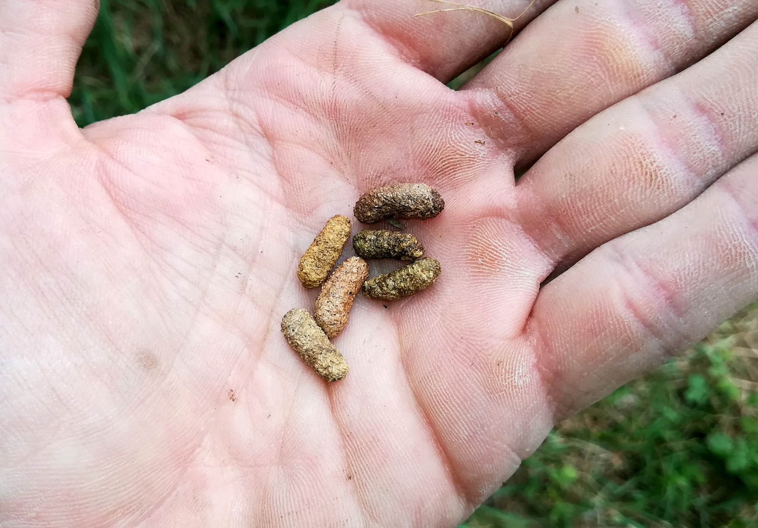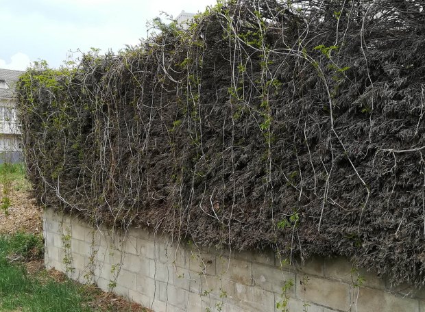 No voy a dar muchos detalles. Tan solo, explicar las fotografías con las que ilustro el caso. Y que cada cual saque sus conclusiones. Veamos. En la imagen número 1, se puede ver un seto formado por tuyas (Thuja). Se trata de una cupresácea muy utilizada para delimitar espacios mediante una cubierta vegetal. Este seto delimita una propiedad particular (vivienda y jardín) que se encuentra rodeada por un par de solares grandes pendientes de urbanizar. Hace un par de años, las tuyas sufrieron un percance y se secaron. Y esto ha permitido aflorar una problemática. Una parte del seto tiene un buen espesor y ha permitido que Rattus rattus anidara en la zona alta. Por otra parte, las ratas comen unos metros más lejos de donde duermen. Su costumbre ha convertido unos puntos del seto en comederos (figuras 2 a 5). Las ratas bajan a buscar comida y parece que, principalmente, comen en estos puntos donde se encuentran seguras. Así pues, observando lo que hay en los comederos se puede ver de qué se alimentan (figuras 6 a 9). Y esto es importante porque los excrementos no son de color negro como suelen ser, sino de color marrón (figuras 10 a 12).