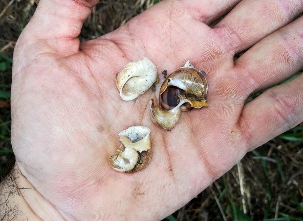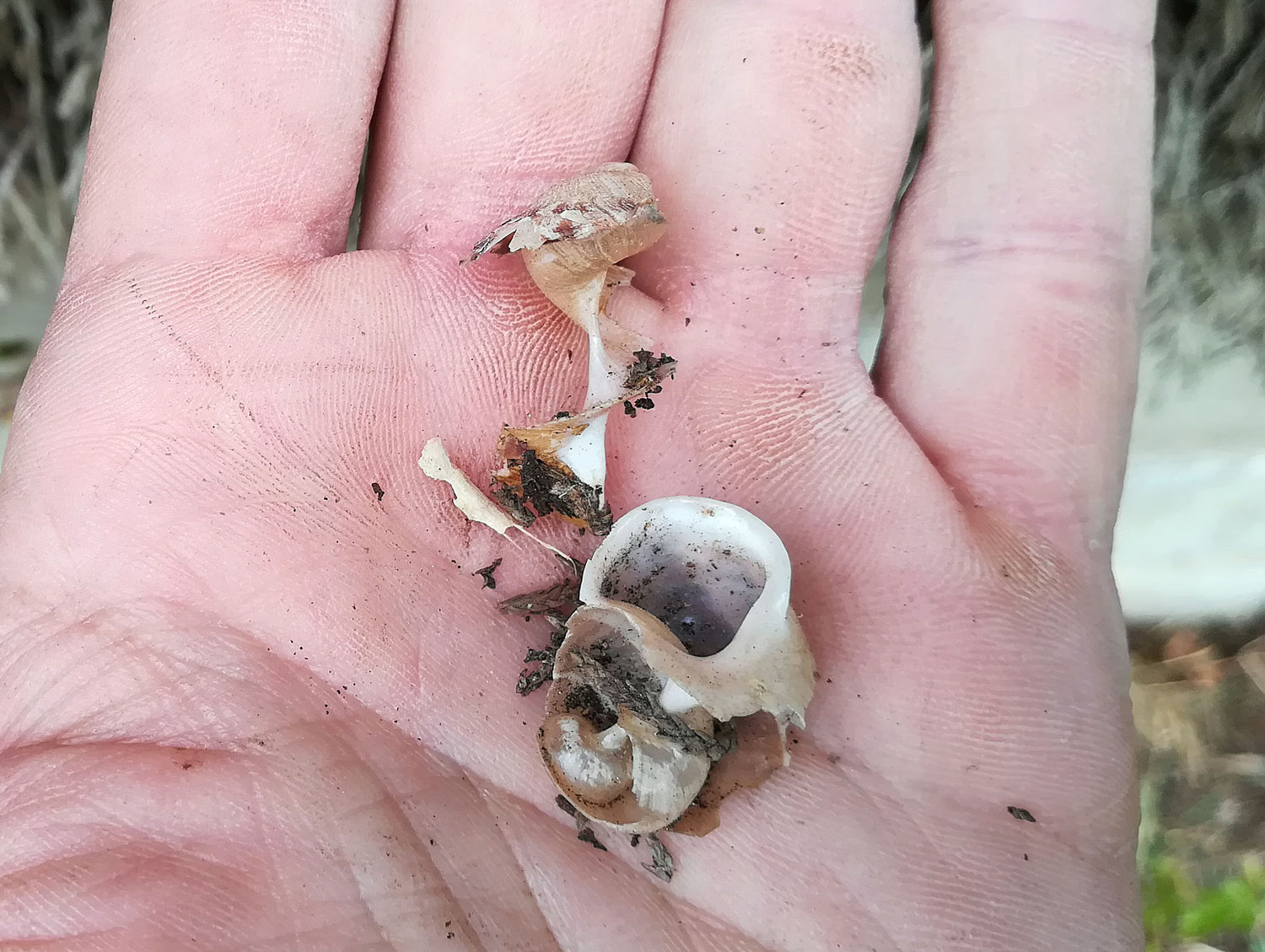 Los alimentos que he identificado son tres. Habrá muchos más, pero no pude dedicarle el tiempo suficiente al caso. En primer lugar, abundaban los restos de una trepadora que he identificado, si no me equivoco, como parra virgen, Parthenocissus quinquefolia (figura 13). En las imágenes se puede ver restos de troncos roídos sobre el suelo de los comederos. Esta especie vegetal se utiliza mucho. En otoño las hojas toman un color rojo muy bonito. En segundo lugar, pude ver bastantes restos de caracoles (figuras 14 y 15) [1]. Sin duda, estaban roídos. Fuera de los comederos, en el suelo, encontré más caracoles roídos que las ratas encuentran fácilmente en los dos solares pendientes de urbanizar donde crece la vegetación. Y en tercer lugar, pude ver cáscaras de nuez (figuras 16). Por supuesto, con más tiempo, podría haber detectado otros alimentos. El caso es que las ratas tenían su dieta en lo que estaban centradas. Así que los cebos rodenticidas, a pesar de colocarlos a su alcance, no parecían interesarles. Seguían con su rutina.