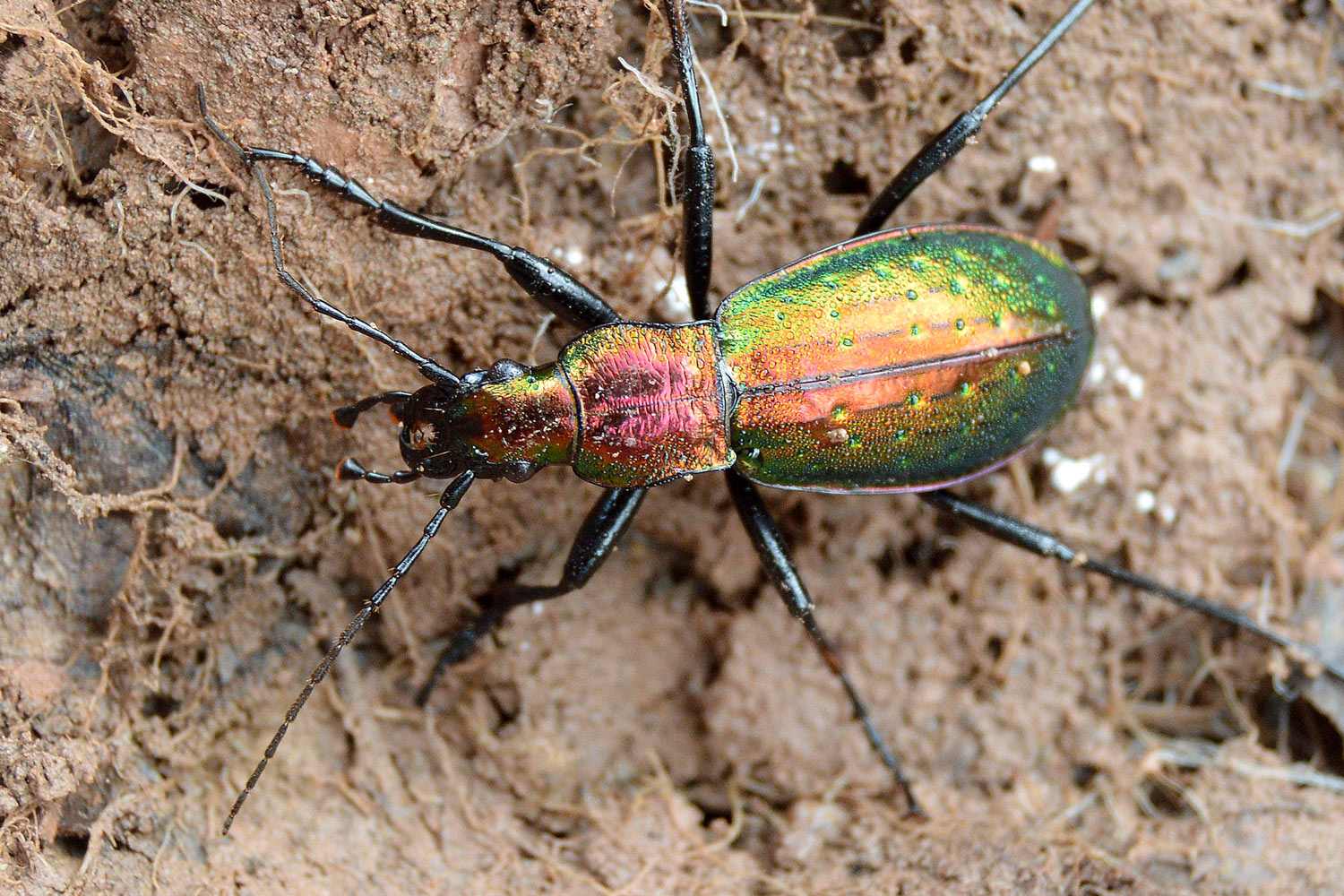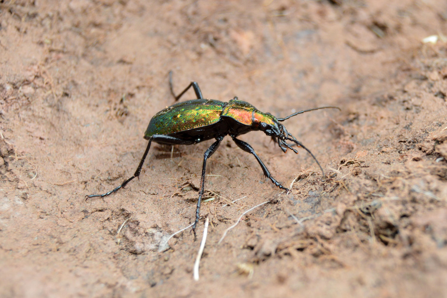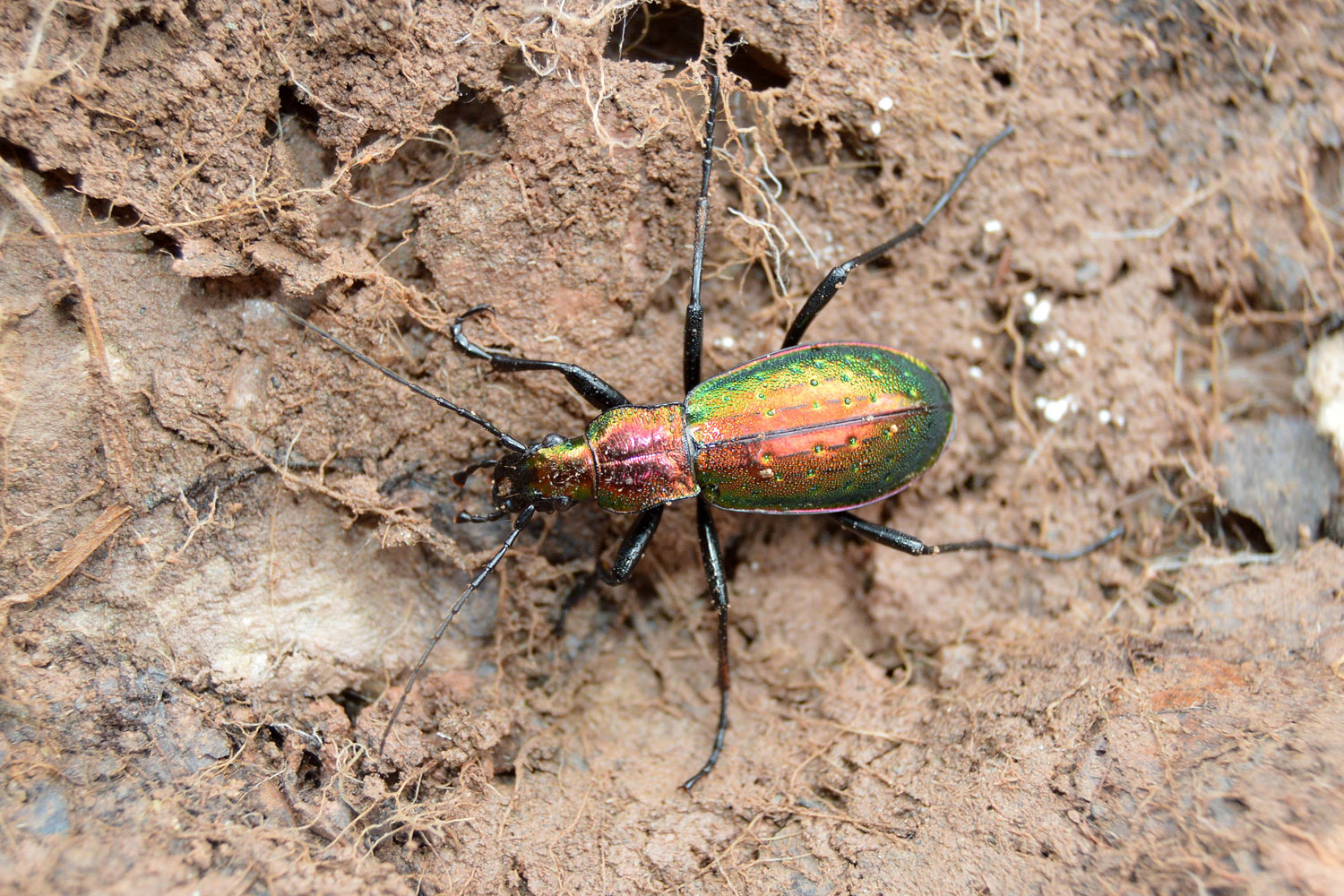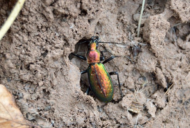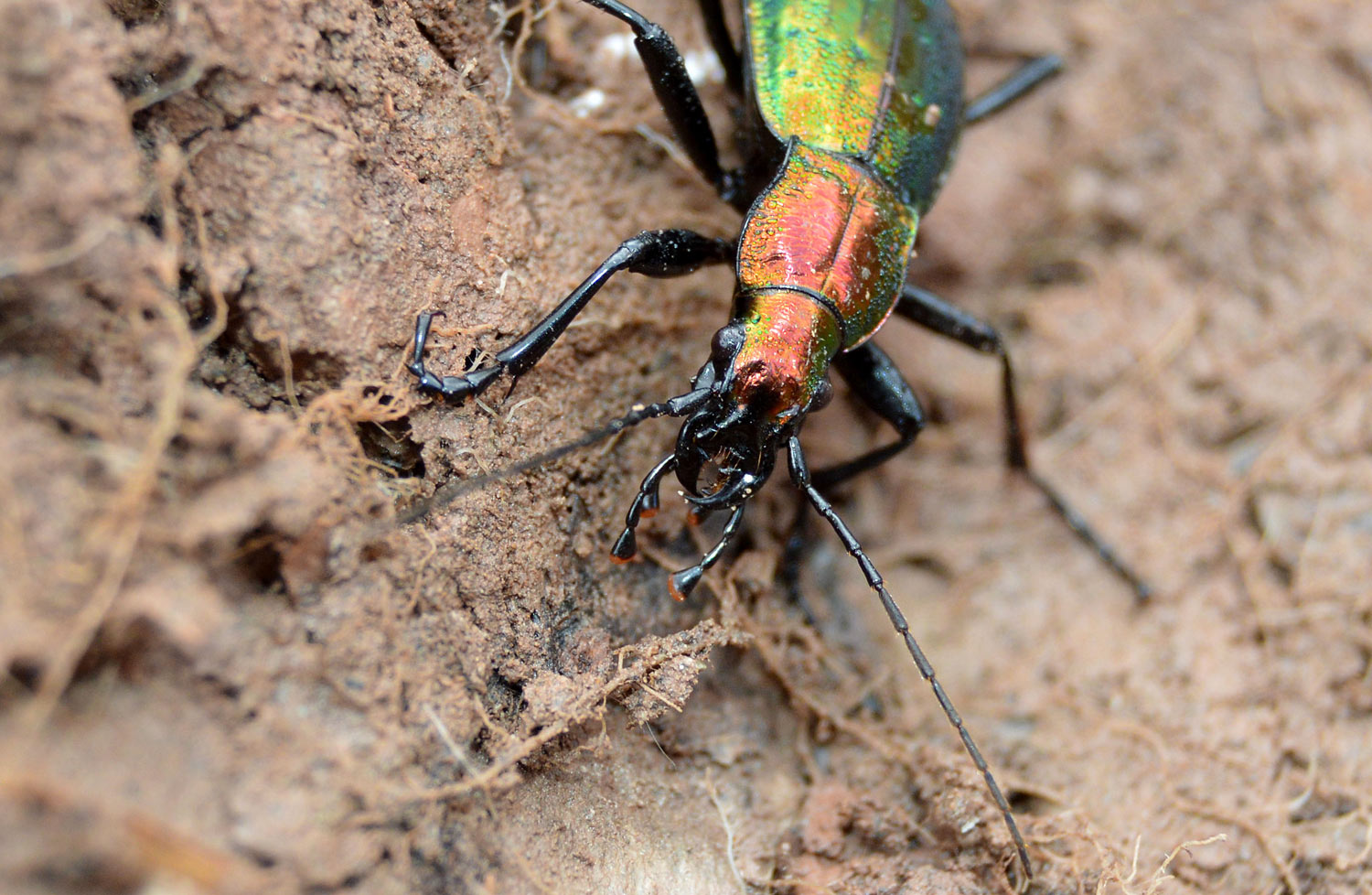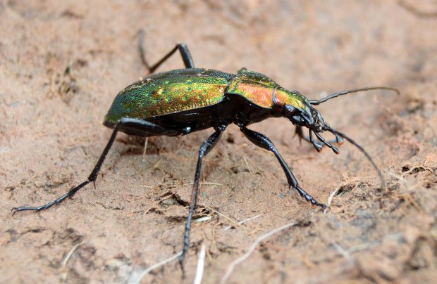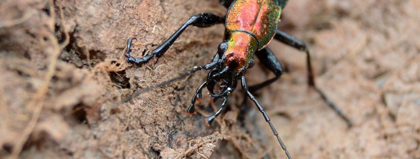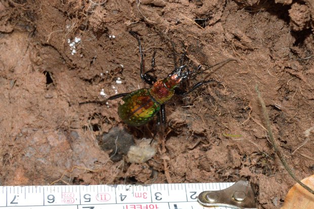 Entre las maravillas que allí había, encontré una escarabajo de colores metálicos de la familia Carabidae. Se trata de una auténtica joya. Levanté una piedra y allí estaba acurrucado. No pude reprimir mi impulso de fotografiarlo. Una vez en casa, no costó identificarlo dada la peculiaridad de su forma y color. Se trata de un cárabo rutilante, Carabus (Chrysocarabus) rutilans [1]. Para esta zona de los Pirineos está registrada la subespecie Carabus (Chrysocarabus) rutilans rutilans [2]. Por lo que pude observar, medía cerca de 35 mm (figura 9). Gracias a esto y a sus largas y finas patas, se trata de un coleóptero imponente. Además de sus colores metálicos, destacan las puntuaciones sobre los élitros. Como se puede observar en las imágenes, está provisto de unas potentes mandíbulas que utiliza para cazar.