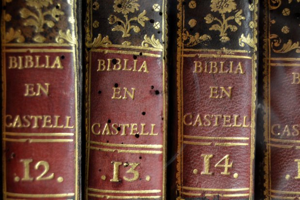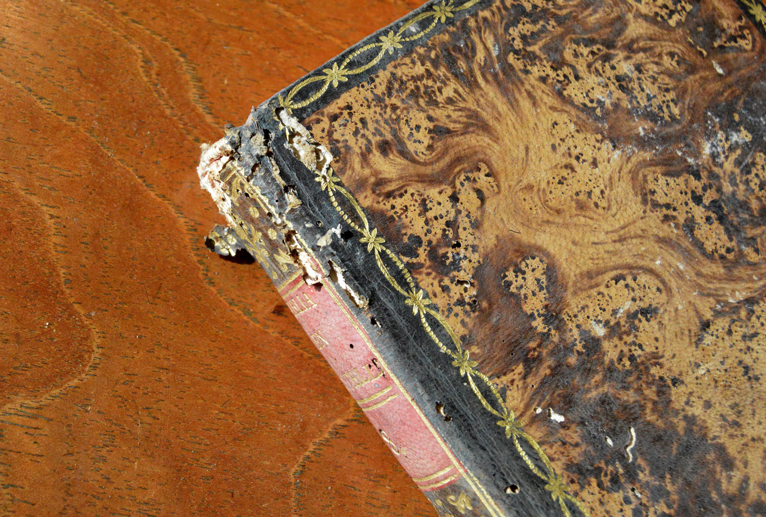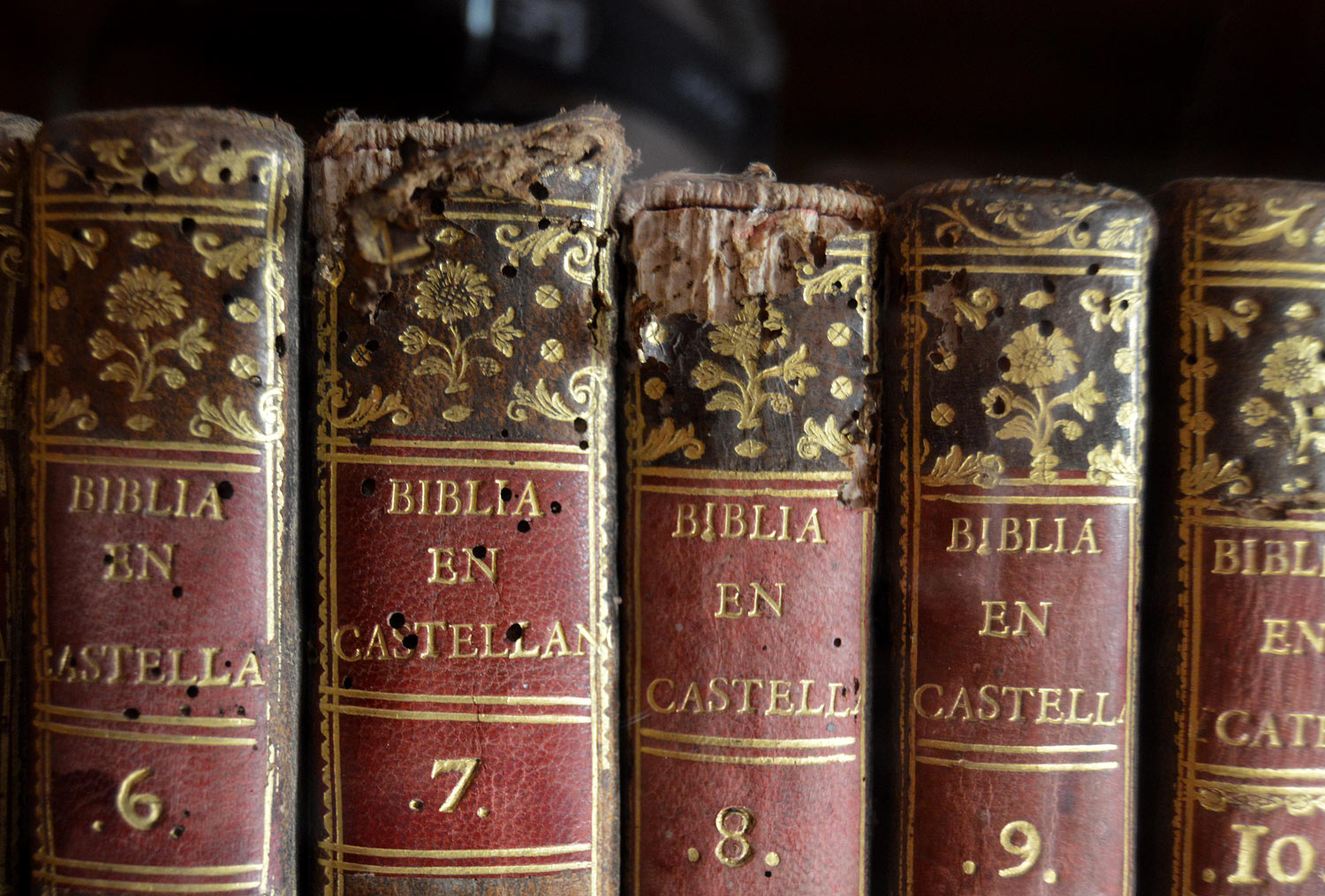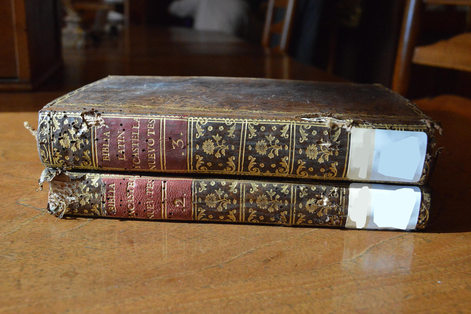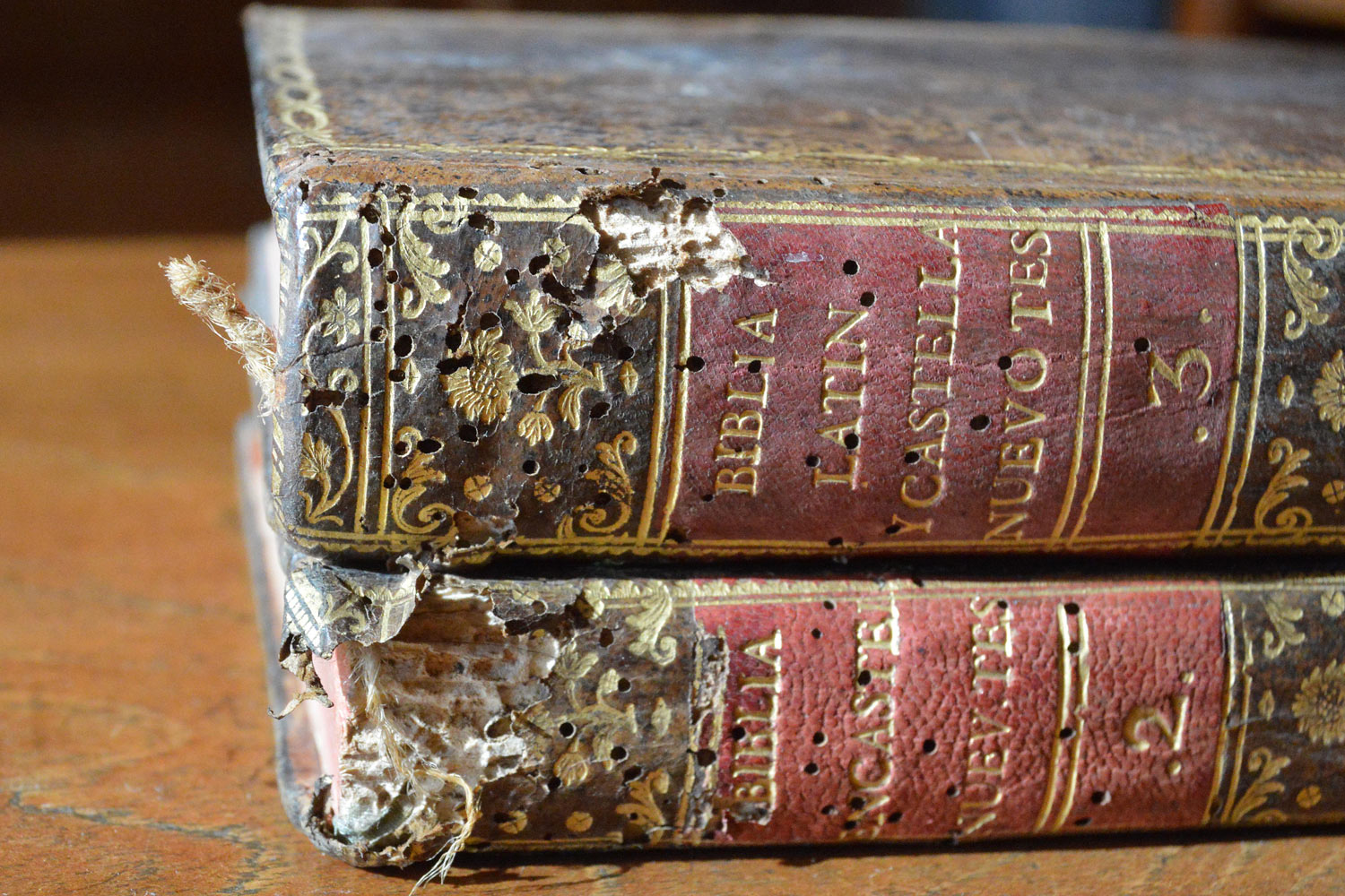 Como no dispongo de suficiente experiencia, no puedo atribuir el deterioro de los libros de las imágenes a una especie en concreto. Además, los daños no eran recientes y no encontré en ellos ningún individuo. Se había tratado años atrás y se había realizado una minuciosa limpieza de estos. Puede ser importante el hecho de que los daños en los libros eran superficiales. Afectaban solo a las tapas de cuero y al papel más cercano. Por otra parte circunscribían a unos pocos tomos de una edición titulada ‘Biblia en castellano’.