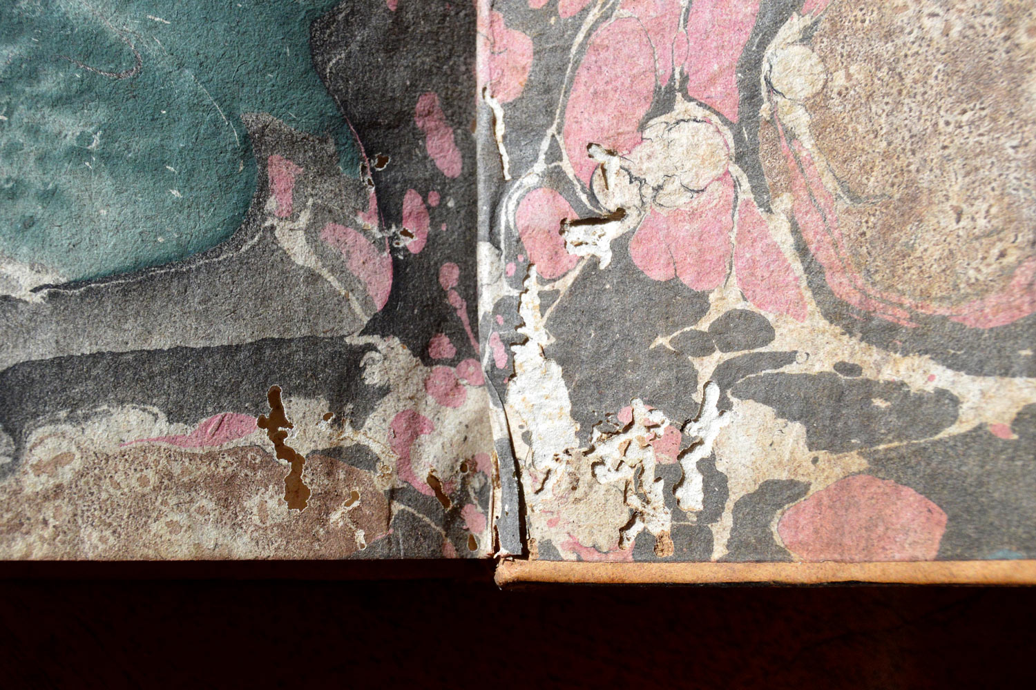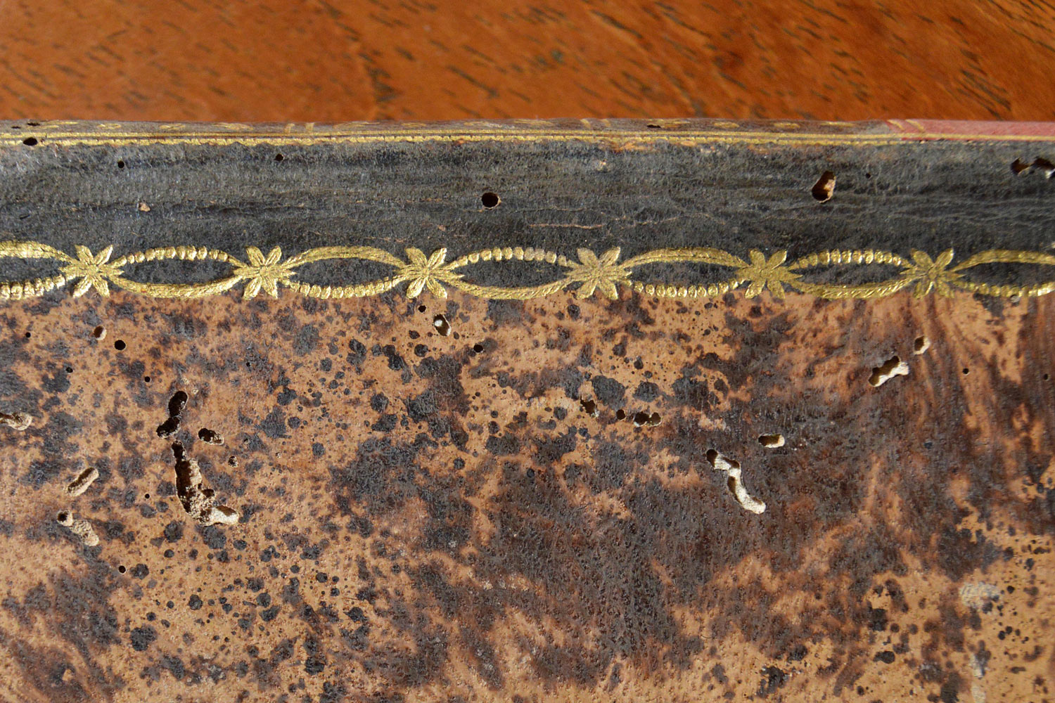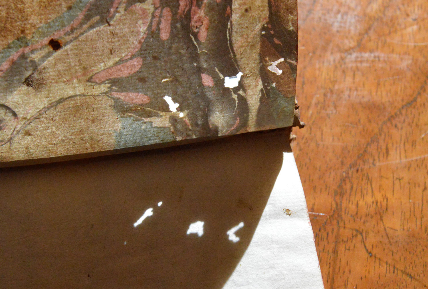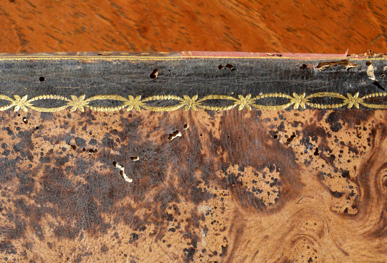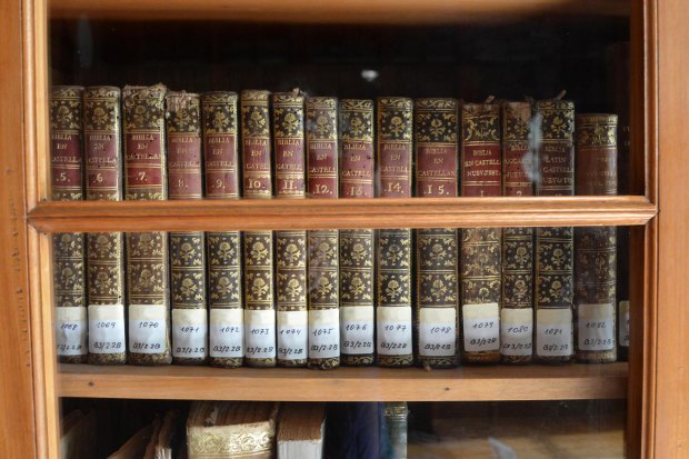 Como no dispongo de suficiente experiencia, no puedo atribuir el deterioro de los libros de las imágenes a una especie en concreto. Además, los daños no eran recientes y no encontré en ellos ningún individuo. Se había tratado años atrás y se había realizado una minuciosa limpieza de estos. Puede ser importante el hecho de que los daños en los libros eran superficiales. Afectaban solo a las tapas de cuero y al papel más cercano. Por otra parte circunscribían a unos pocos tomos de una edición titulada ‘Biblia en castellano’.