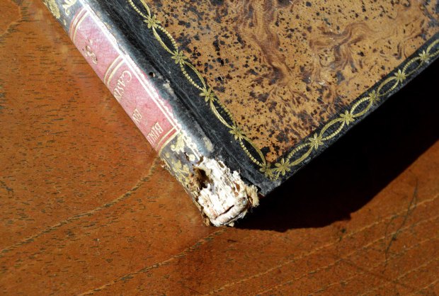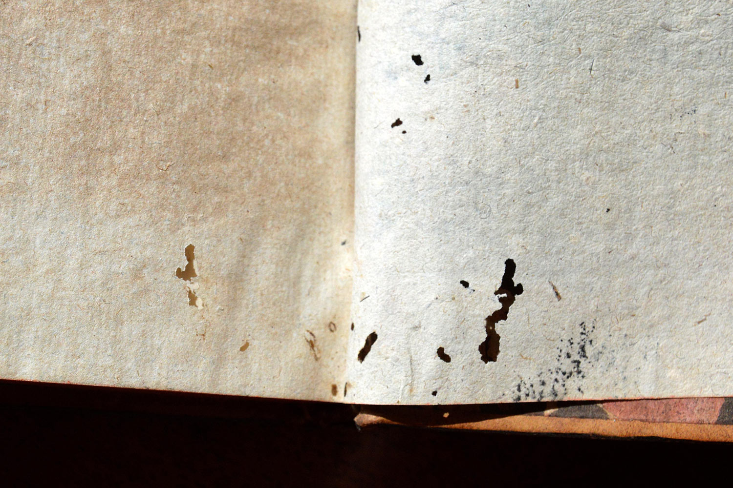 Fig 2. Libros dañados por anóbidos (Anobiidae)./ C. Pradera 09-2018