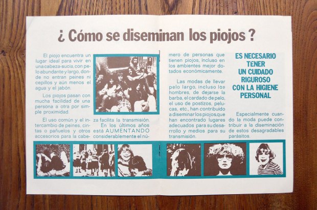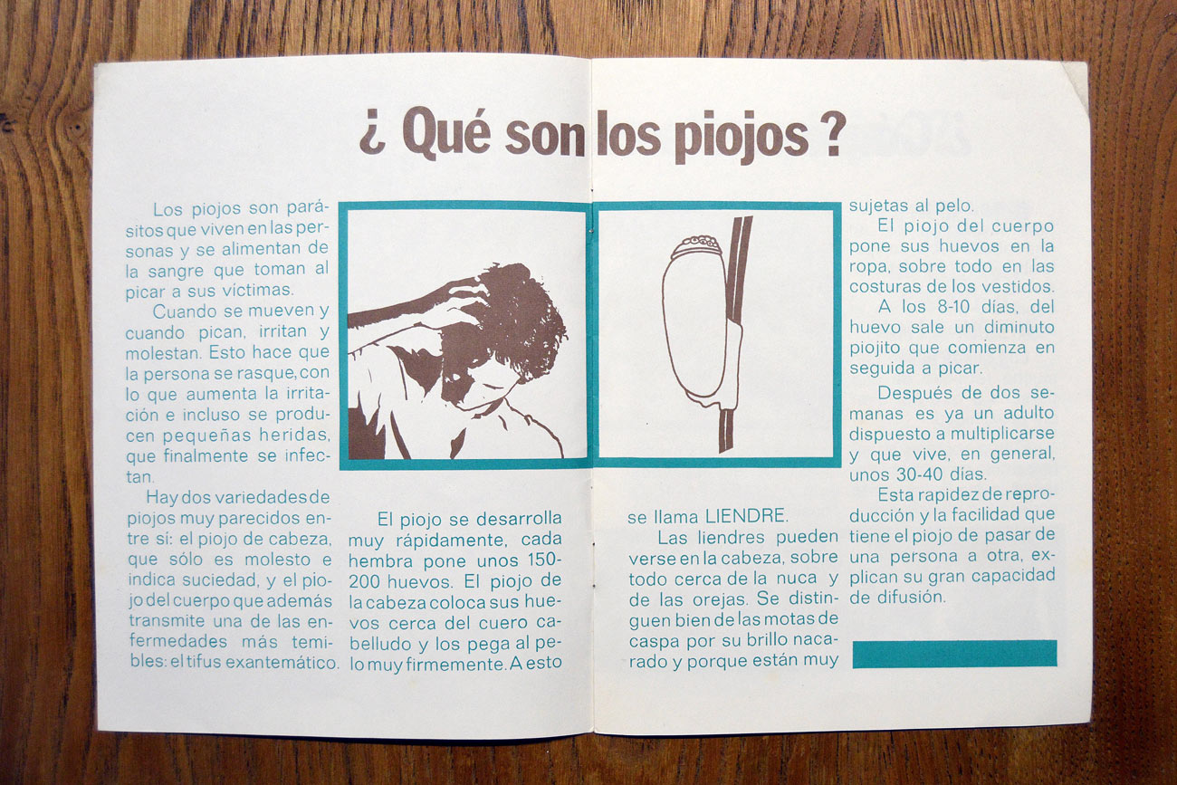 He encontrado un folleto que la Dirección General de Sanidad publicó en 1976 sobre los piojos de la cabeza (Pediculus humanus capitis). Consta de ocho páginas y se encuentra dividido en tres apartados: ¿Cómo son los piojos? ¿Cómo se diseminan los piojos? ¿Cómo librarse de los piojos?