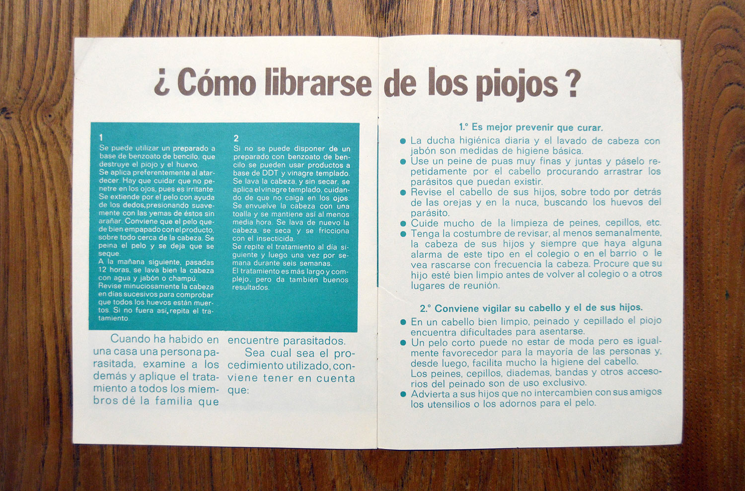 El contenido es sencillo y claro. El tamaño de letra es grande y el tipo de letra diáfano. Se trata de un panfleto para que resulte inteligible para cualquier ciudadano. Y fue publicado en 1976, según se puede ver en su última página (Depósito Legal de Madrid 41.380-1976). La pregunta es qué justifica la confección del panfleto. Y la respuesta está en uno de sus párrafos: «En los últimos años está AUMENTANDO considerablemente el número de personas que tienen piojos, incluso en los ambientes mejor dotados económicamente.»