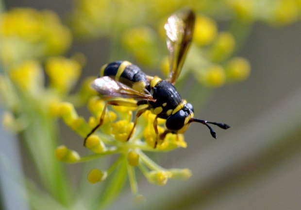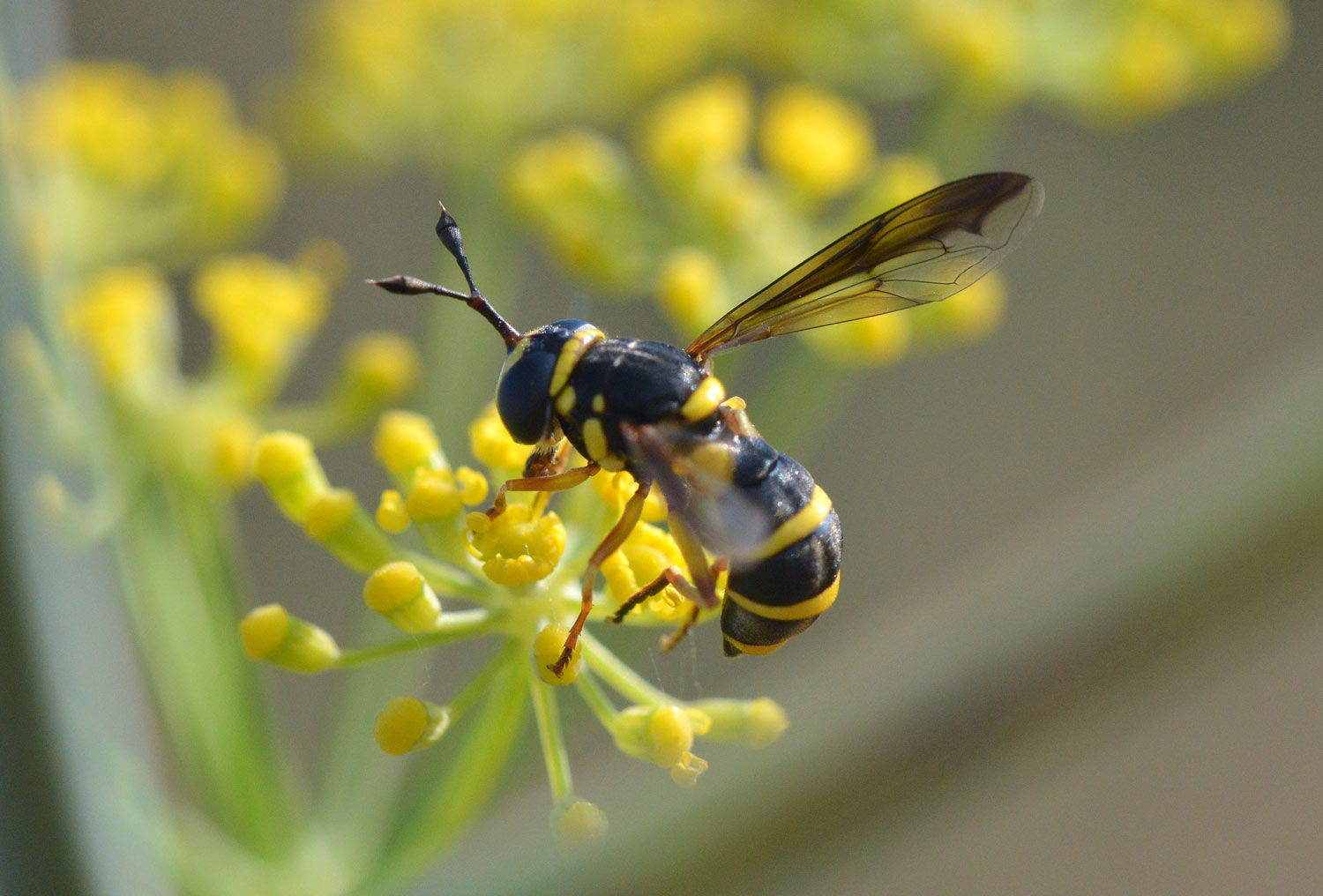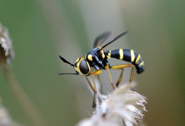 En las imágenes 1, 2 y 3, se puede ver un sírfido (Syrphidae) de la especie Ceriana vespiformis. Su nombre le fue expresamente puesto para indicar su aspecto de avispa. Por un lado, tiene una forma bien parecida: abdomen largo y estrecho en su unión al tórax, antenas largas, tórax abultado. Por otro lado, tiene los colores negro y amarillo que dibujan un patrón parecido al de muchas avispas que nos advierten de peligro. Este patrón es muy similar en cabeza, tórax y abdomen. También en referencia a colores, un detalle interesante es que la parte anterior de las alas es oscura mientras que la posterior es transparente. Me da la sensación que podría tratarse de un engaño. Los dípteros poseen solo dos alas, como su nombre indica. Y las avispas poseen cuatro alas largas, estrechas y transparentes. Cabe la posibilidad de que el aspecto de las alas de Ceriana vespiformis tengan ese color oscuro. Al quedar dividas en dos, podría hacer pensar que tiene dos alas donde solo hay una.