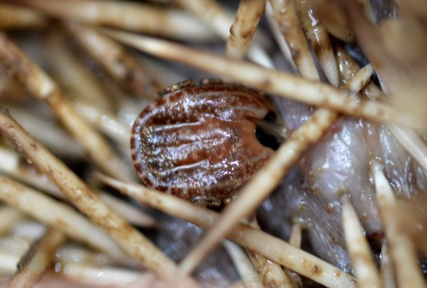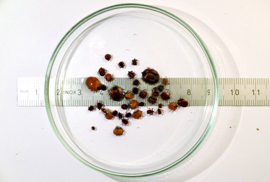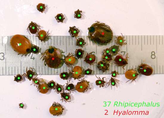 Horas más tarde, cuando tuve tiempo de observarlo, me di cuenta de que estaba lleno de garrapatas. Y a mí, las garrapatas me interesan mucho. Así que aproveché para recoger todas las que encontré. En las imágenes 2 y 3, se pueden ver. En total, fueron 39 entre machos y hembras. No había larvas, todas adultas. A algunas hembras les quedaba poco para soltarse y llevar a cabo la puesta. Lo que pude ver desde el principio es que todas pertenecían a un mismo género, a Rhipicephalus, a excepción de dos que son del género Hyalomma. En casa me entretuve observándolas e inspeccionándolas para poder saber a qué especie pertenecían. Y después de un buen rato mirando con la lupa binocular, pude determinar que pertenecían a Rhipicephalus sanguineus y a Hyalomma lusitanicum. Para ello utilicé la magnífica guía ‘Ticks of Europe and North Africa’ de Agustín Estrada Peña [1]. Lo cierto es que la identificación de garrapatas no es tarea fácil. Y más cuando te enfrentas sin tener a mano otras especies con las cuales comparar.
