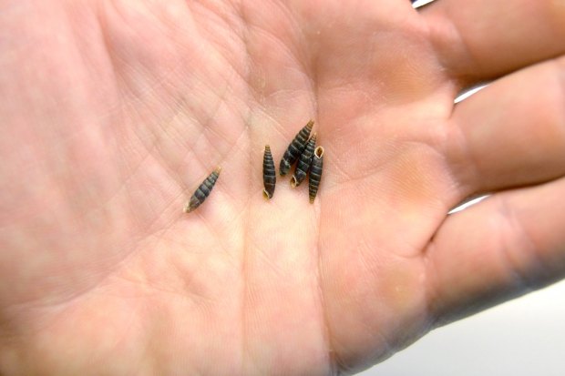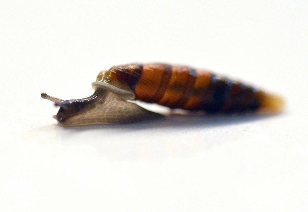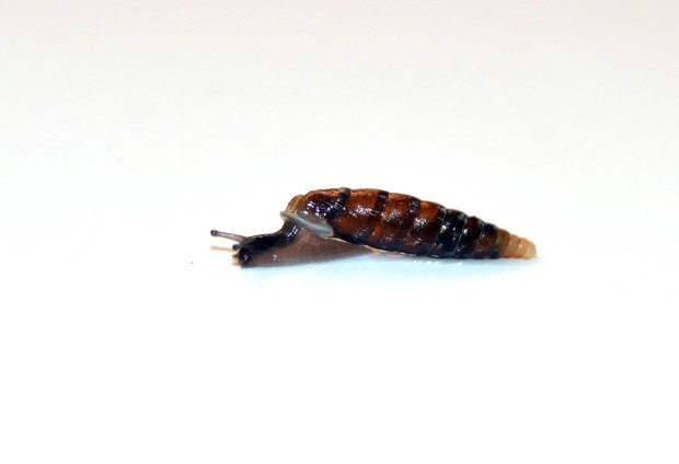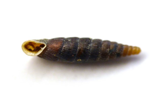 En casa vi que todos pertenecían todos al género Clausilia de la familia de los clausílidos (Clausiliidae). No me atrevo a determinar la especie, ya que requiere conocimientos que no tengo por el momento. Se trata de un género nativo de Europa que se encuentra en lugares húmedos. Los Clausilia se alimentan de vegetación en descomposición y de hongos y líquenes que crecen sobre rocas y árboles [1]. Los ejemplares que recogí miden entre 10-12 mm de largo y tienen las vueltas estriadas (figura 2 a 4). Como se puede ver en las imágenes, el molusco es pequeño en comparación a su concha (figuras 5 a 11). Los clausílidos se caracterizan por tener un particular aparato obturador que dispone de una placa llamada clausilio. Esto permite que, cuando el moslusco se retira dentro, la concha quede sellada [2]. Se trata de un buen mecanismo de protección.