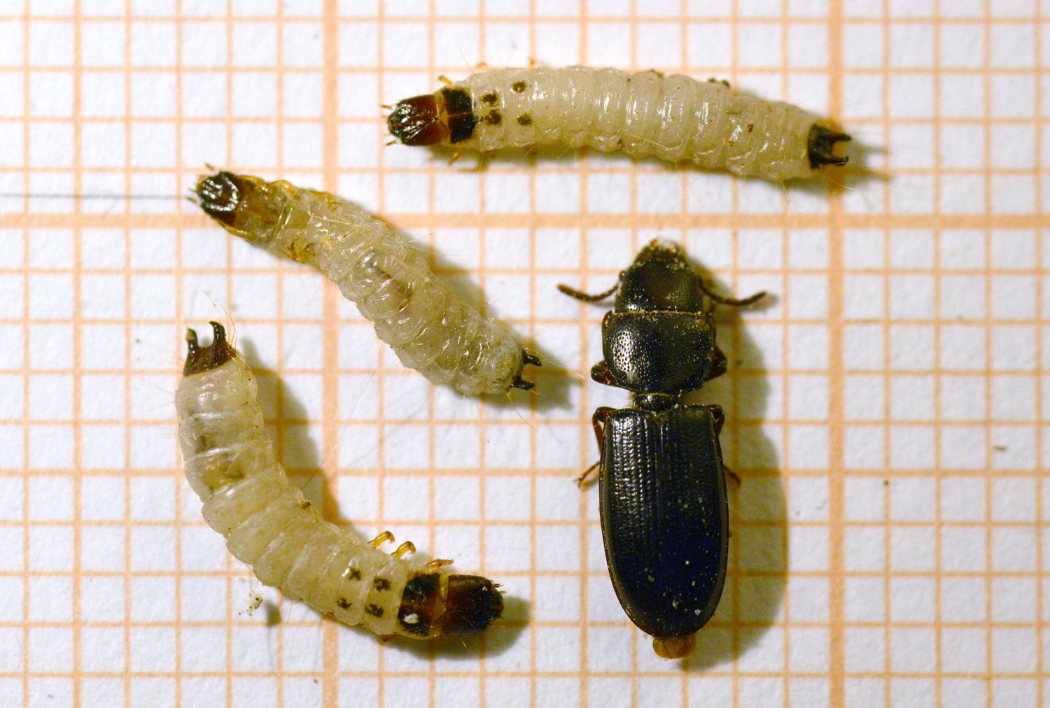 Pues bien, encontré uno bien interesante. Se trata del coleóptero Tenebroides mauritanicus, perteneciente a la familia Trogosssitidae y conocido comúnmente como carcoma grande de los granos. Como se puede ver en las imágenes, el adulto y la larva tienen un aspecto característico. Destaca del adulto la forma de su pronoto, cabeza, mandíbulas y antenas. Según los manuales, puede medir hasta los 10 mm. La larva es blanquecina. Tiene oscuro el primer segmento del tórax y, sobre los dos restantes, se dibujan un par de manchas negras. En el extremo del abdomen posee dos apéndices en forma de tenedor. Puede llegar hasta los 15 mm y está considerada una de las larvas de mayor tamaño que ataca los granos almacenados. La hembra puede depositar hasta 1.000 huevos sobre los granos. Tanto la larva como el adulto se alimentan del germen del grano. Pueden desarrollarse sobre trigo, maíz y sus derivados, entre otras materias primas.