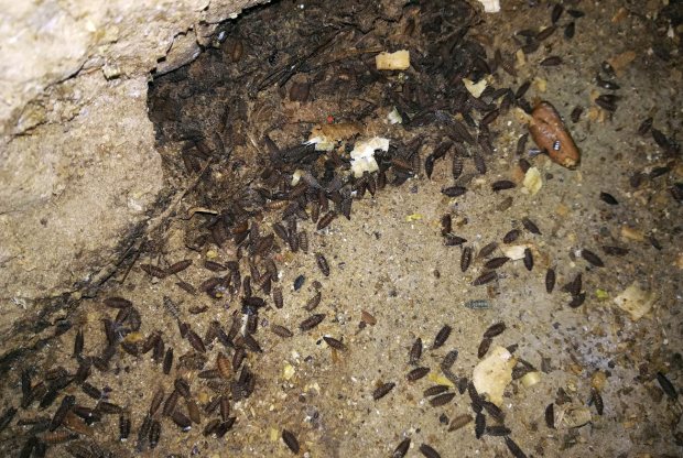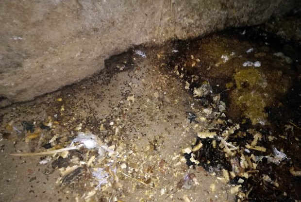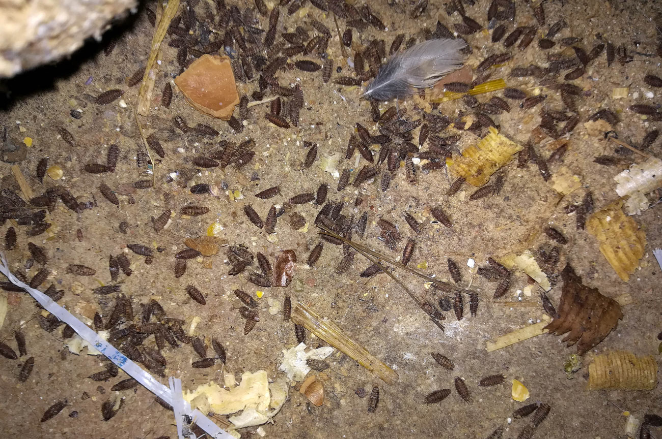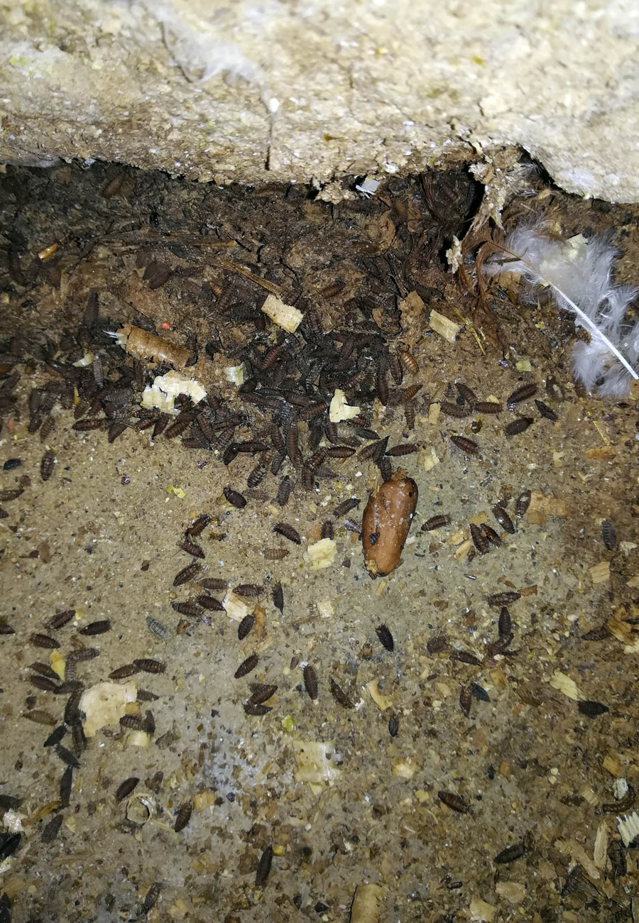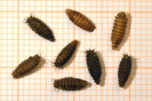 Pero si es fácil ver Fannia en un entorno urbano, no lo es tanto encontrar larvas. De hecho, en lo que llevo de tiempo en este oficio, he tenido pocas ocasiones de ver larvas. Recuerdo una cocina húmeda y sucia en la que se habían desarrollado en la zona del lavavajillas. Las larvas tienen un aspecto característico e inconfundible (figura 3). Por suerte, me quité esta espinita el pasado viernes cuando pude ver centenares de larvas y pupas en el suelo de un gallinero. Se trata de un lugar ideal para su desarrollo. En la imagen número 1, se puede ver la situación general del suelo del gallinero y, en las imágenes 6 a 8, el detalle. Las larvas de Fannia se alimentan de materia orgánica en descomposición con preferencia por excrementos de gallinas, caballos, vacas y humanos. A diferencia de la mosca doméstica (Musca domestica), el huevo y la larva de Fannia requieren mayor humedad para su desarrollo. La mosca doméstica puede desarrollarse en estiércol seco, mientras que Fannia requiere que el estiércol sea semilíquido [2]. La larva pasa por tres estadios antes de pupar. El ciclo completo de esta mosca lo puede completar en 15 días en verano.