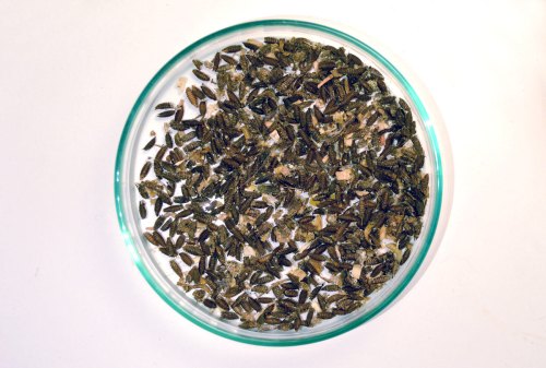 En la imagen número 1, se puede ver en la parte derecha una zona húmeda con excrementos de gallina que caen de una batería de jaulas. Es allí donde se desarrolla la larva. Y en la parte izquierda, hay un montón de pupas, ya que la larva parece que se mueve buscando una zona más seca para su metamorfosis en adulto. Aproveché para recoger una muestra de larvas y pupas del gallinero. En la imagen número 2, se puede ver la muestra representada por varios cientos de pupas en metamorfosis, pupas vacías y, en menor medida, larvas. Y en la imagen número 3, se pueden ver algunas pupas con un poco más de detalle. La larva de Fanniidae es característica como se puede observar. Tiene aspecto aplanado, segmentado y dispone de procesos por todo el cuerpo que son más largos en el extremo posterior. A través de la observación de la larva, se puede determinar la especie. Hasta donde he podido observar, he determinado que las pupas pertenecen a la especie Fannia cunicularis [3]. Sin embargo, voy a esperar a que emerja un buen número de adultos para observarlos en detalle.