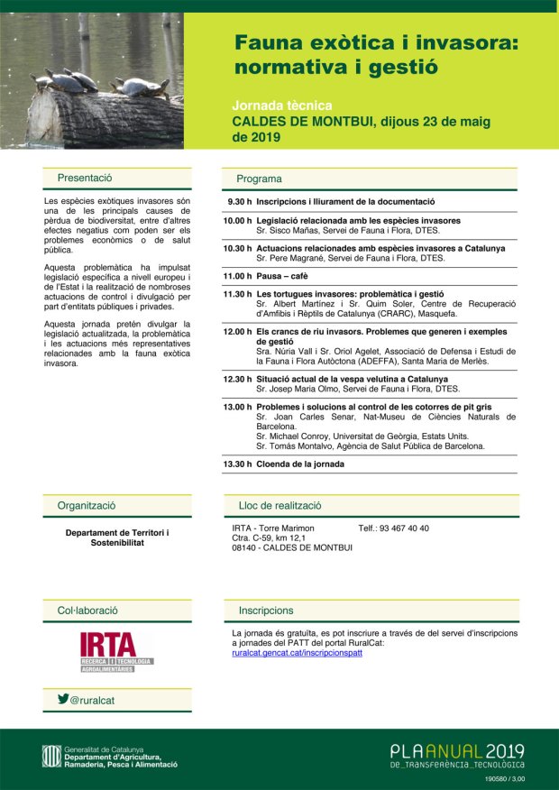 Esta mañana, jueves 23 de mayo de 2019, se ha realizado una interesante jornada técnica dedicada a la fauna exótica en invasora en el auditorio del IRTA en Torre Marimon, en Caldes de Montbui. La jornada ha sido organizada por el Departament de Territori i Sostenibilitat (DTES) de la Generalitat de Catalunya bajo el título ‘Fauna exótica e invasora: normativa y gestión’ (figura 4).