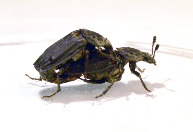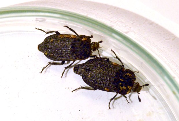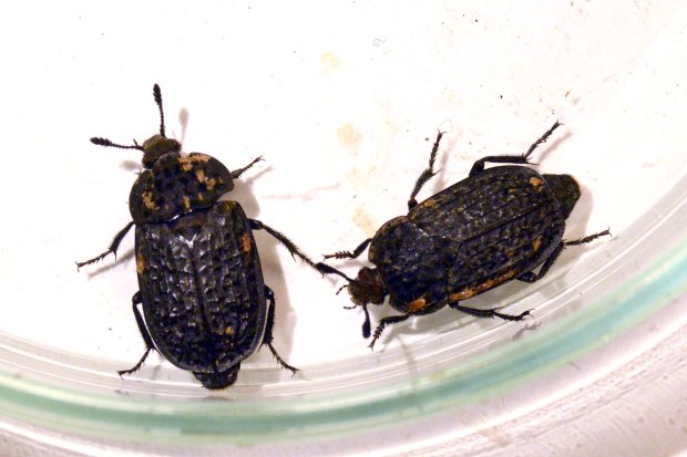 Pues bien, unos 7 días después, acudí al mismo cadáver y pude ver otra especie del mismo género. En casa, determiné que se trataba de T. rugosus. En esta entrada, doy cuenta con imágenes de estos preciosos coleópteros que acuden a los cadáveres a alimentarse. Las doce primeras imágenes corresponden a T. sinuatus. Se puede ver un macho y una hembra. En esta especie, se distinguen bien ambos géneros gracias a la diferente forma de los élitros. En el macho, el extremo de los élitros es anguloso. Mientras que en la hembra es romo. Las restantes imágenes corresponden a T. rugosus.