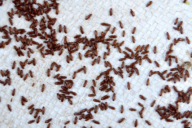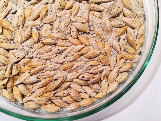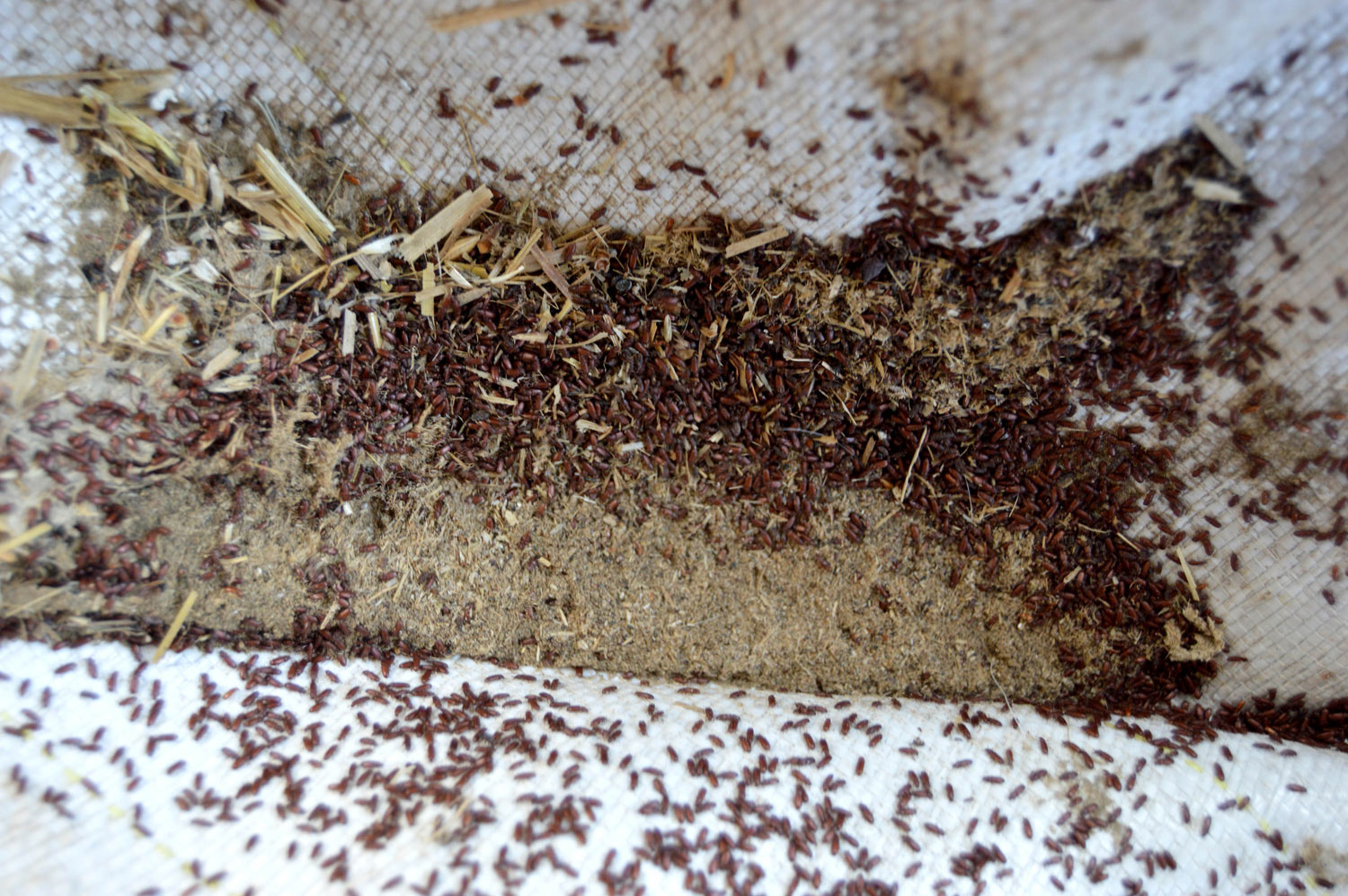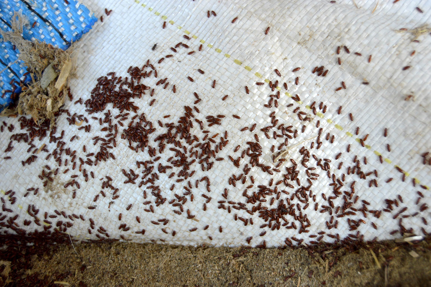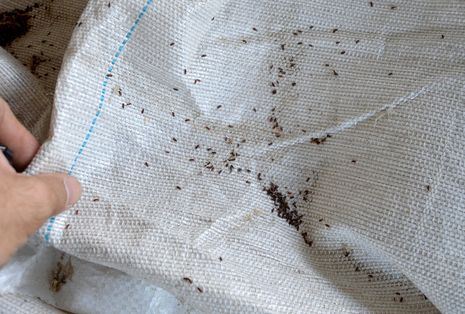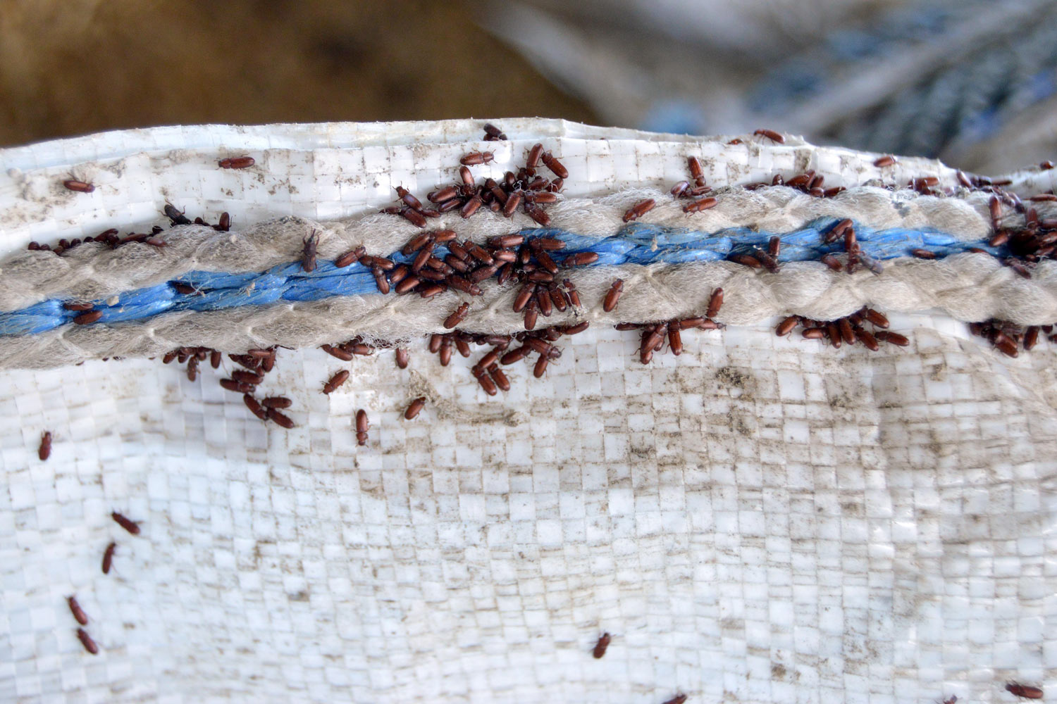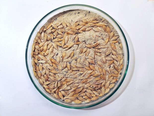 Encontré en un cliente en Porqueres, Girona, un par de sacas con grano de cereal, cebada probablemente, almacenadas desde hacía un par de años. Estaba lleno de escarabajos (Coleoptera) que consideramos plaga de los productos almacenados. Y también había avispas parasitoides (Hymenoptera) que completan su ciclo sobre los escarabajos considerados plaga. De hecho, había visto el par de sacas meses atrás en invierno. Pero no fue hasta el pasado mes de mayo que decidí recoger una muestra para observar qué especies había. Las sacas eran de tipo estandarizado para una capacidad de unos 1.000 kg, pero no estaban llenas hasta arriba.