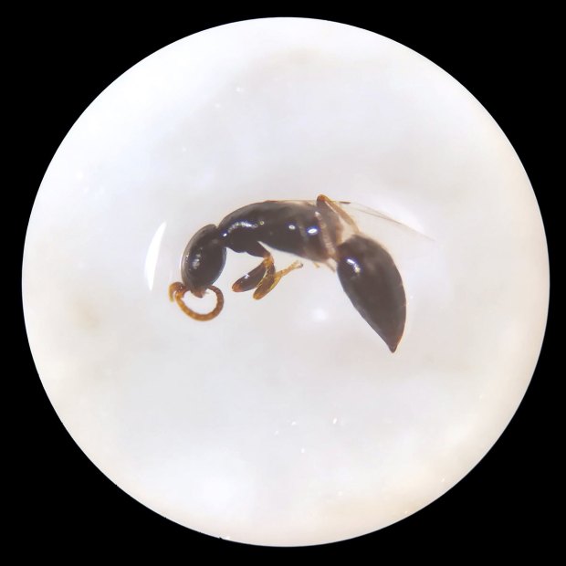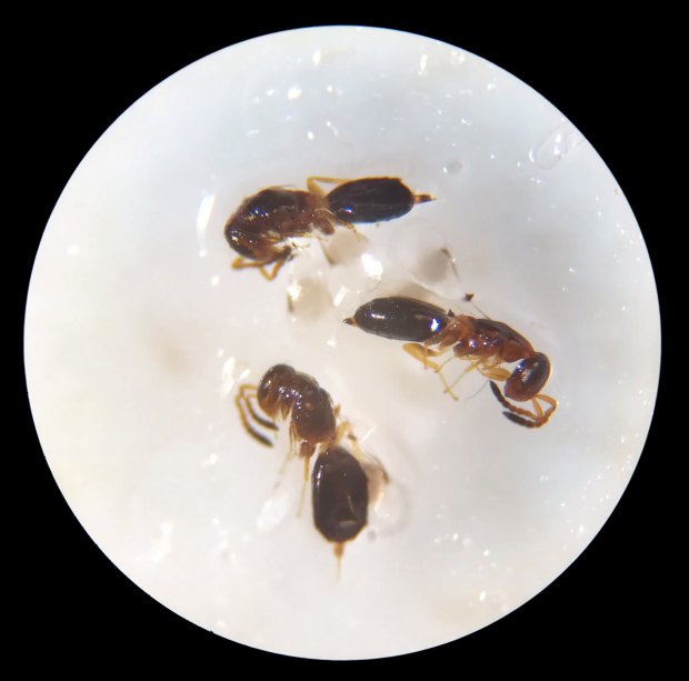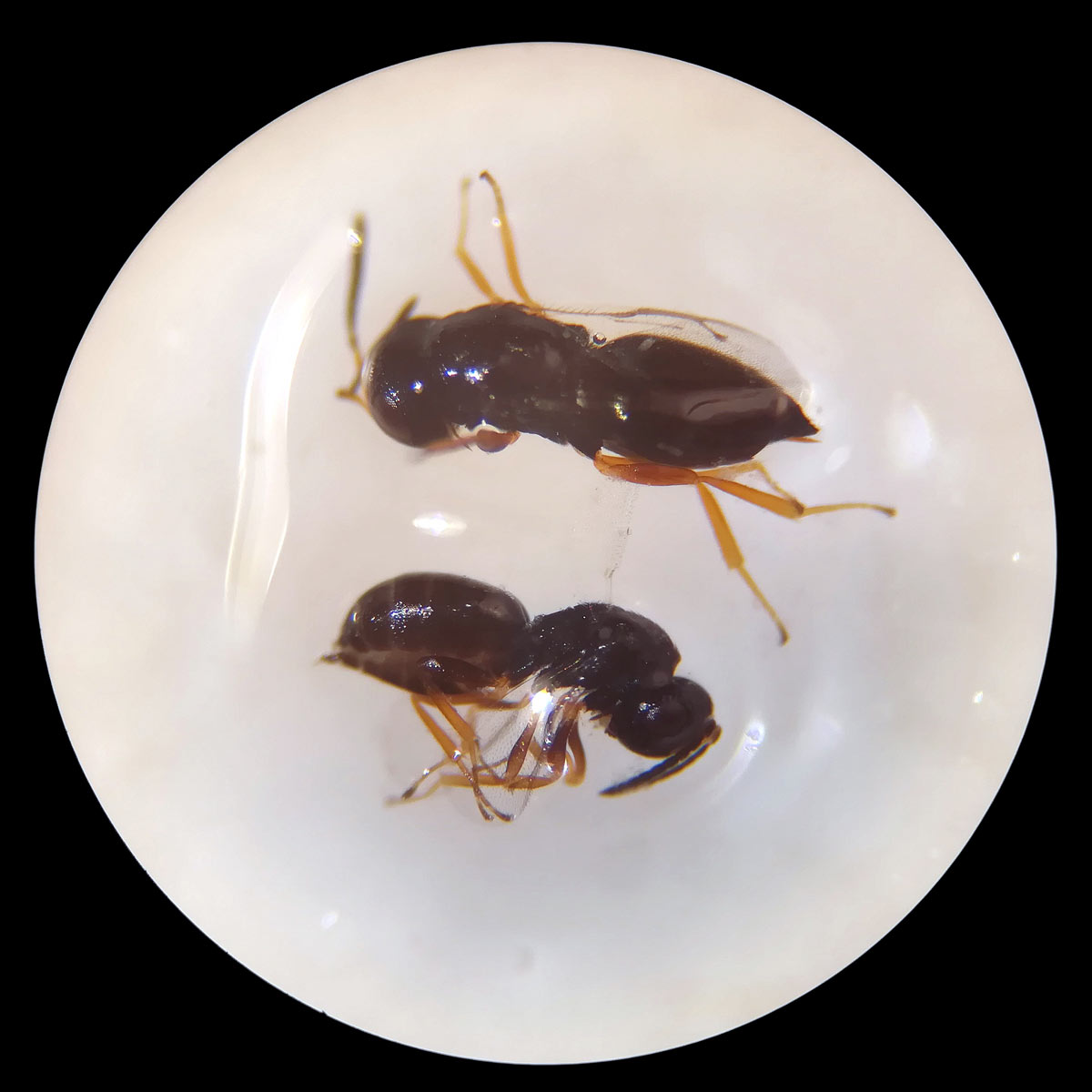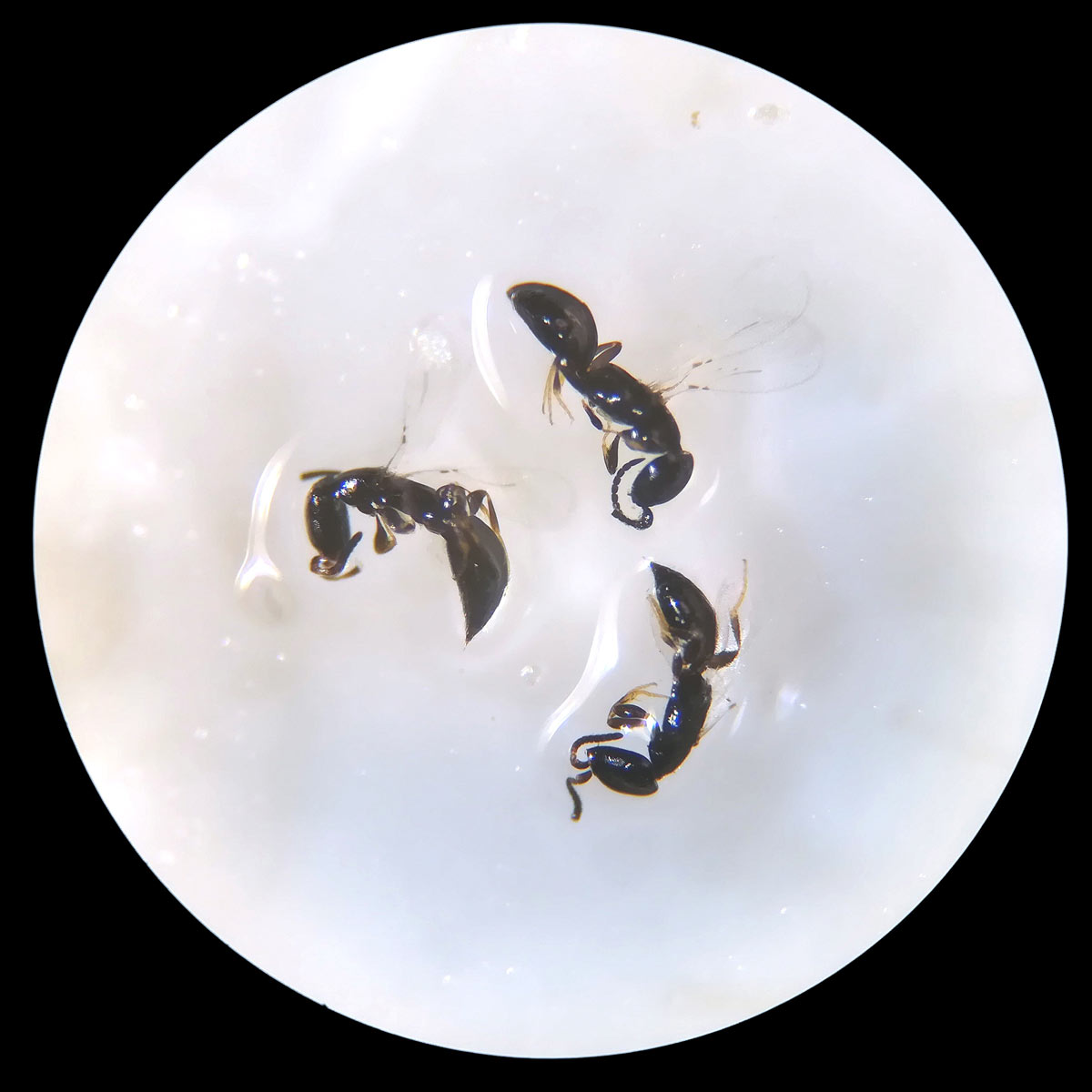 Respecto a los himenópteros parasitoides, encontré cuatro especies que se pueden ver juntas en la imagen número 22. He identificado tres de ellas. Se trata de dos Pteromalidae y dos Bethylidae. Las especies son, según creo, estas: Theocolax elegans (figura 23), Anisopteromalus calandrae (figura 24) y Cephalonomia waterstoni (figura 25), Holepyris glabratus (figura 26).