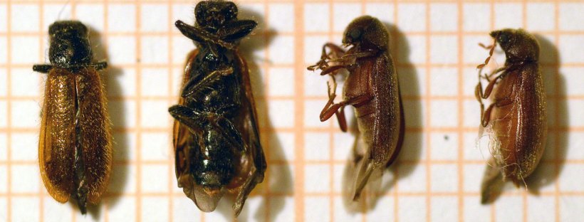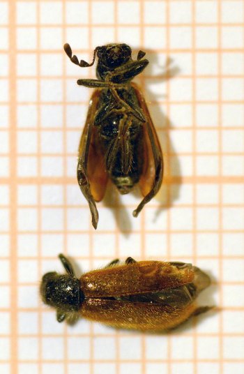 La otra especie no la había visto antes. No la reconocí como coleóptero xilófago. Pero al atar cabos, relacioné una con otra. Y entonces di con la especie. Se trataba de Enoplium serraticorne, un clérido que depreda las larvas de los anóbidos (Anobiidae). En la ‘Guía de los coleópteros de España y Europa’ [1], se describe su biología. «Vive asociado a diversos anóbidos (carcomas) de los que se alimenta. Las larvas se desarrollan en el interior de madera vieja obrada y también en los libros atacados por dichos coleópteros. Los adultos aparecen en primavera y principio de verano persistiendo hasta agosto» (pp. 499-500). Según este manual, su distribución sería Europa meridional y norte de África. Se especifica que es muy común en las zonas mediterráneas de la Península Ibérica y también en Baleares. En esta guía se dan las medidas de 4-7 mm para la longitud del adulto.