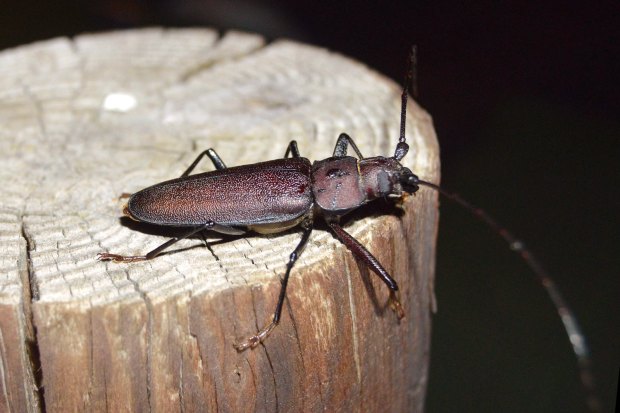 La semana pasada, me entretuve por la noche buscando insectos nocturnos en Sant Llorenç de Morunys, Solsonès (Lleida). Y en concreto, lo que buscaba eran longicornios (Cermabycidae), ya que estamos en el mes de julio. Uno de los lugares de obligado paso en una inspección nocturna es la zona de contenedores de basura. Al tratarse de una población de montaña, miré allí si había alguna cucaracha silvestre del género Ectobius. Y por supuesto, encontré. Ahora bien, mi sorpresa fue cuando en lo alto de un poste, vi un macho de Ergates faber (figuras 1 y 2). Me hizo mucha ilusión.