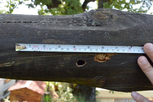 Según Eduard Vives, en su manual dedicado a los cerambícidos [2], la larva de Ergates faber se desarrolla principalmente en coníferas de género Pinus, Abies y Cedrus. Tiene preferencia por «tocones cortados de más de dos años». Esto indica que una madera de conífera puesta en obra con la humedad necesaria puede ser un buen lugar donde se desarrollen las larvas. De hecho, al día siguiente, aproveché un momento para buscar en la zona las maderas afectadas. Por suerte, encontré algunas. En la imagen número 4, se puede ver una valla a base de troncos que delimita la carretera de acceso al Camping Morunys. Allí pude ver varios troncos afectados por lo que debía ser Ergates faber. En la imagen número 5, se puede ver un tronco transversal que tenía un buen número de agujeros de salida. Y en las imágenes 6 a 9, se puede ver detalle de estos agujeros. Como se observa, las poderosas mandíbulas del adulto de Ergates faber, no trabajan fino como otros cerambícidos de menor tamaño. Los agujeros de salida son ovalados y pueden medir hasta 2 centímetros.