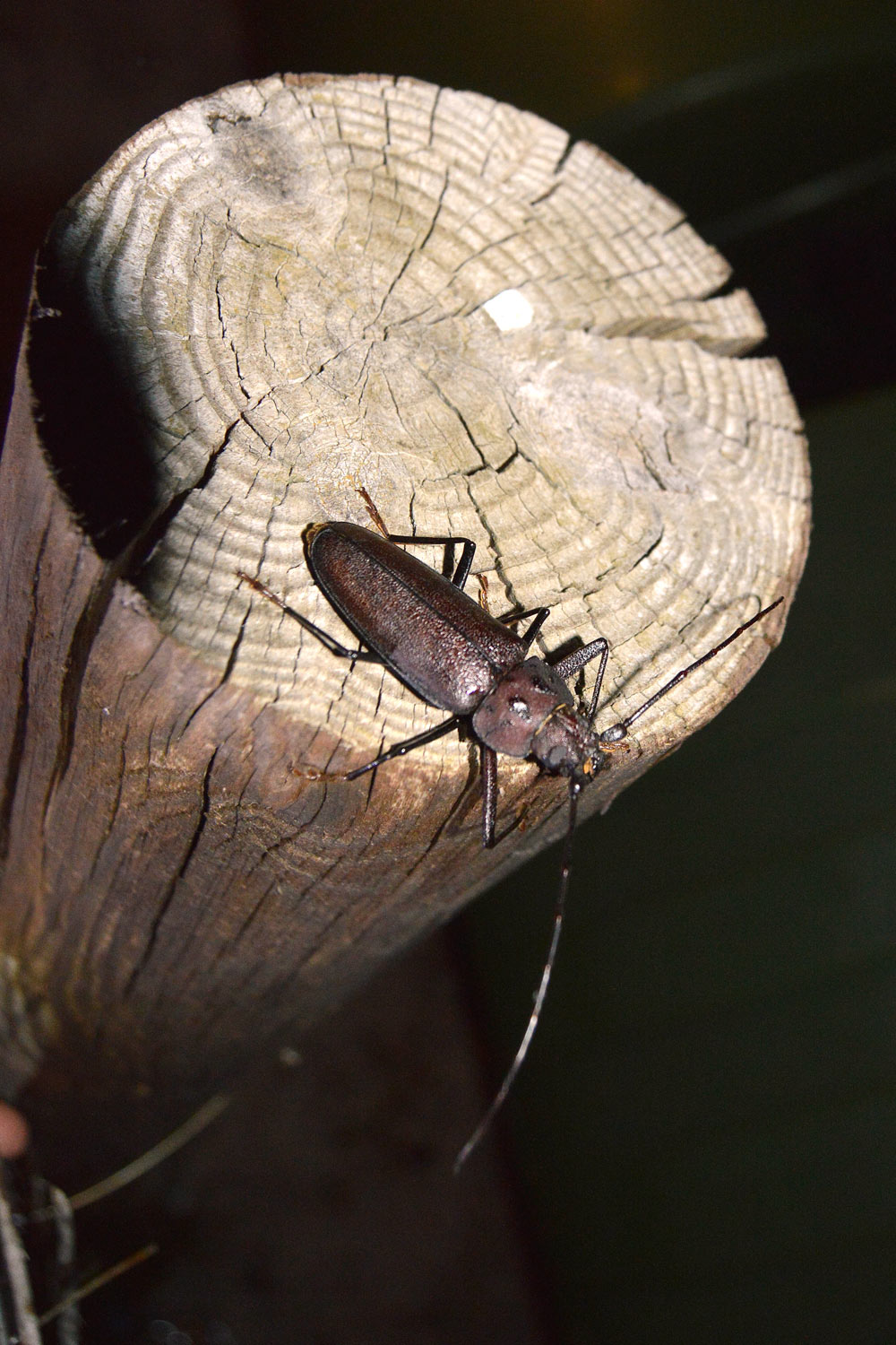 La semana pasada, me entretuve por la noche buscando insectos nocturnos en Sant Llorenç de Morunys, Solsonès (Lleida). Y en concreto, lo que buscaba eran longicornios (Cermabycidae), ya que estamos en el mes de julio. Uno de los lugares de obligado paso en una inspección nocturna es la zona de contenedores de basura. Al tratarse de una población de montaña, miré allí si había alguna cucaracha silvestre del género Ectobius. Y por supuesto, encontré. Ahora bien, mi sorpresa fue cuando en lo alto de un poste, vi un macho de Ergates faber (figuras 1 y 2). Me hizo mucha ilusión.