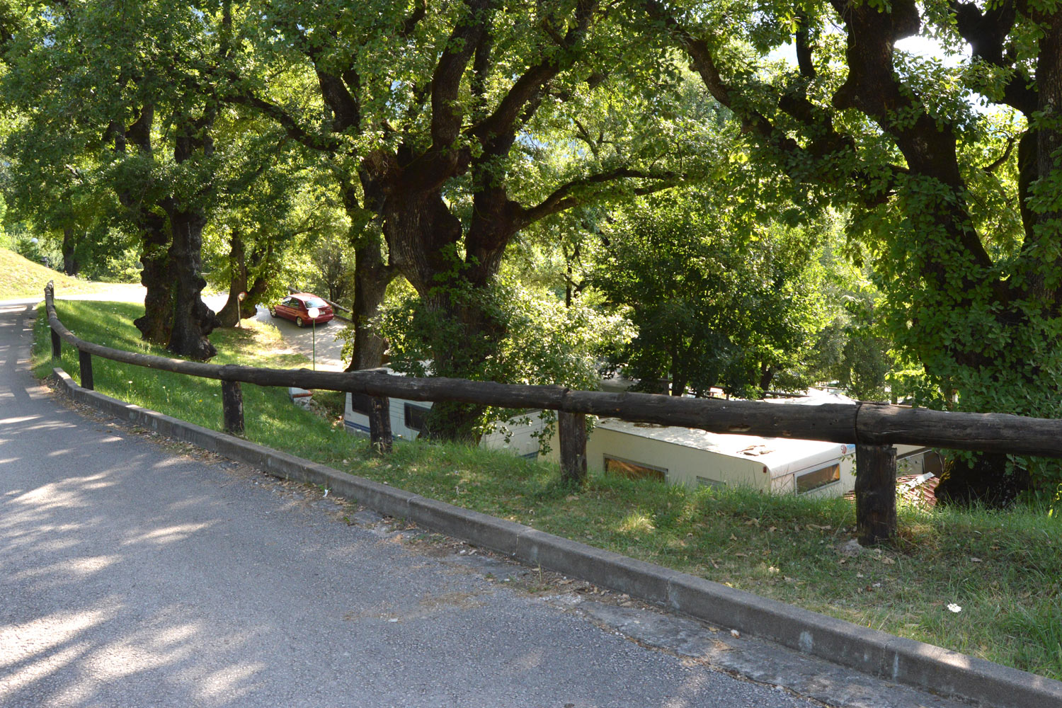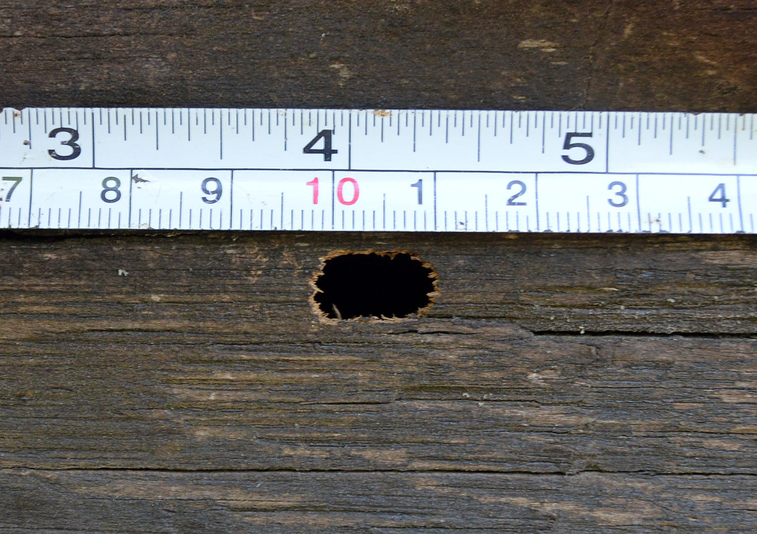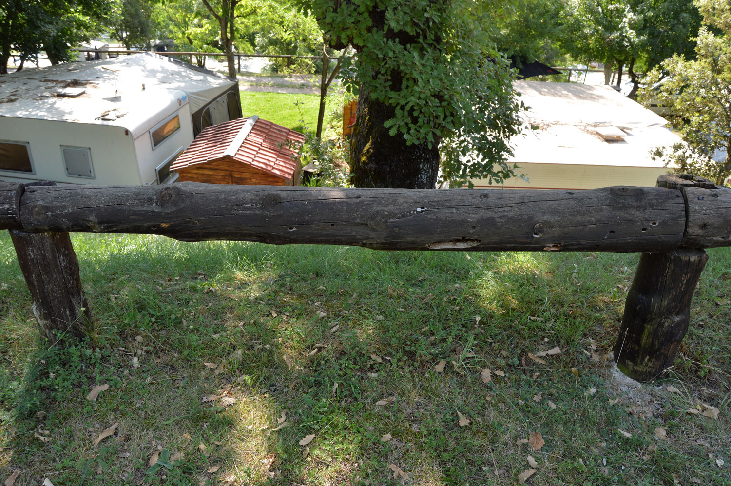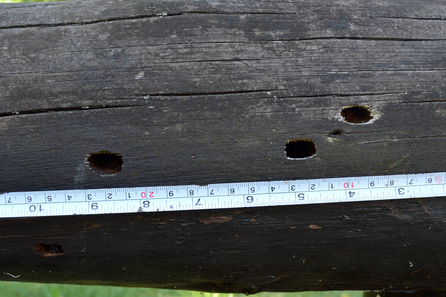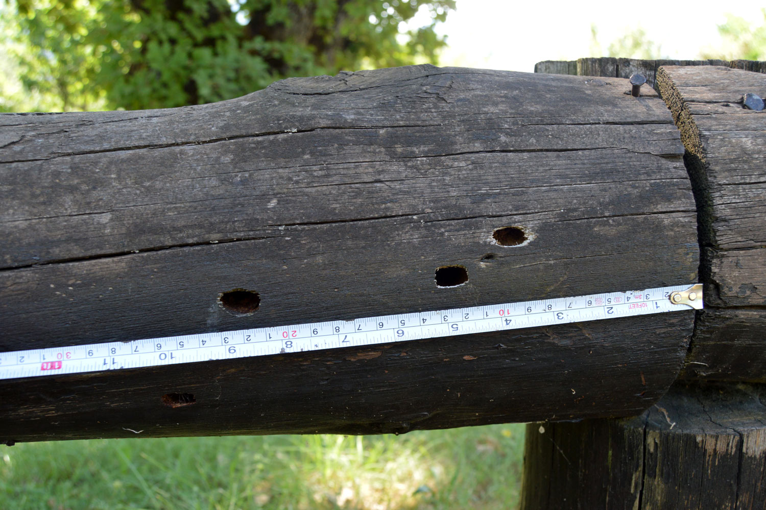 Según Eduard Vives, en su manual dedicado a los cerambícidos [2], la larva de Ergates faber se desarrolla principalmente en coníferas de género Pinus, Abies y Cedrus. Tiene preferencia por «tocones cortados de más de dos años». Esto indica que una madera de conífera puesta en obra con la humedad necesaria puede ser un buen lugar donde se desarrollen las larvas. De hecho, al día siguiente, aproveché un momento para buscar en la zona las maderas afectadas. Por suerte, encontré algunas. En la imagen número 4, se puede ver una valla a base de troncos que delimita la carretera de acceso al Camping Morunys. Allí pude ver varios troncos afectados por lo que debía ser Ergates faber. En la imagen número 5, se puede ver un tronco transversal que tenía un buen número de agujeros de salida. Y en las imágenes 6 a 9, se puede ver detalle de estos agujeros. Como se observa, las poderosas mandíbulas del adulto de Ergates faber, no trabajan fino como otros cerambícidos de menor tamaño. Los agujeros de salida son ovalados y pueden medir hasta 2 centímetros.