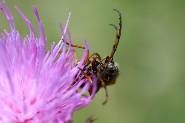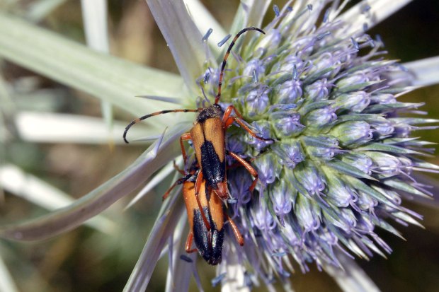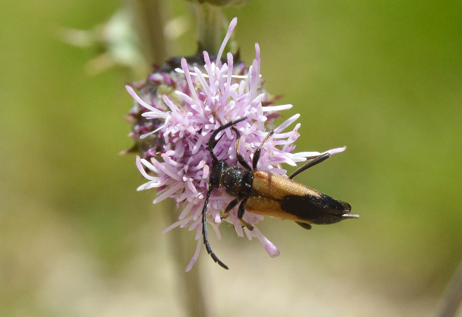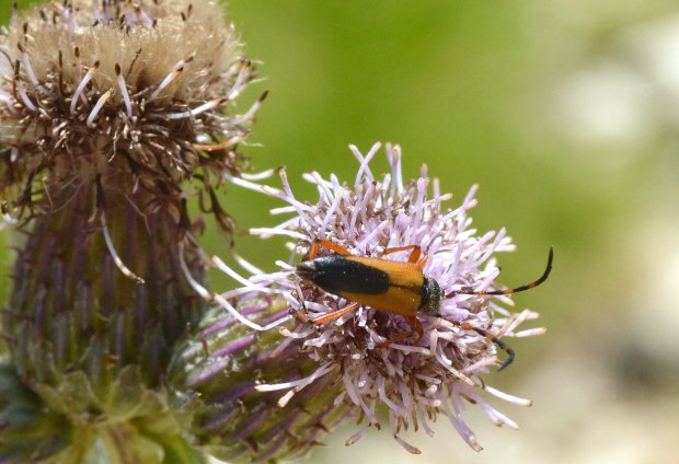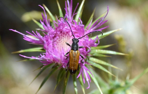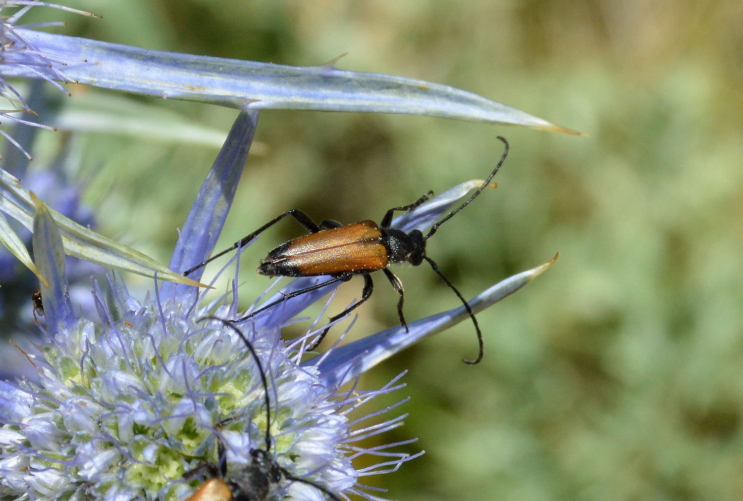 La zona es ideal para el desarrollo de cerambícidos y otros insectos xilófagos. En la imagen número 2, se puede ver detalle de una ladera junto al camino. Se encuentra llena de tocones y restos de poda como resultado de trabajos de silvicultura. Esto da vida a un buen número de insectos que encuentran en la madera degradada alimento y cobijo. Al llegar a casa, pude determinar que en mis fotografías había dos especies distintas de cerambícidos de la tribu Lepturini. Por un lado y en mayor número, encontré Anastrangalia sanguinolenta (figuras 3-8, 16-17). Por otro lado y en menor número, encontré Stictoleptura stragulata (figuras 9 a 17).