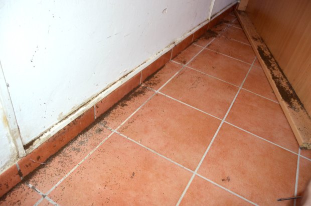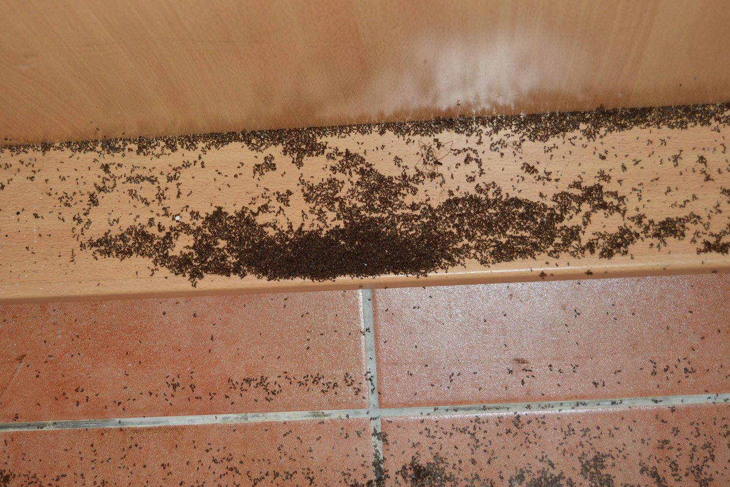 Fig 2. Acumulación de obreras muertas de Lasius neglectus detrás del cabecero del dormitorio./ C. Pradera 09-2019