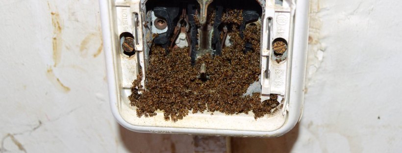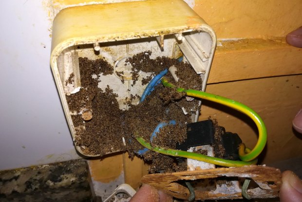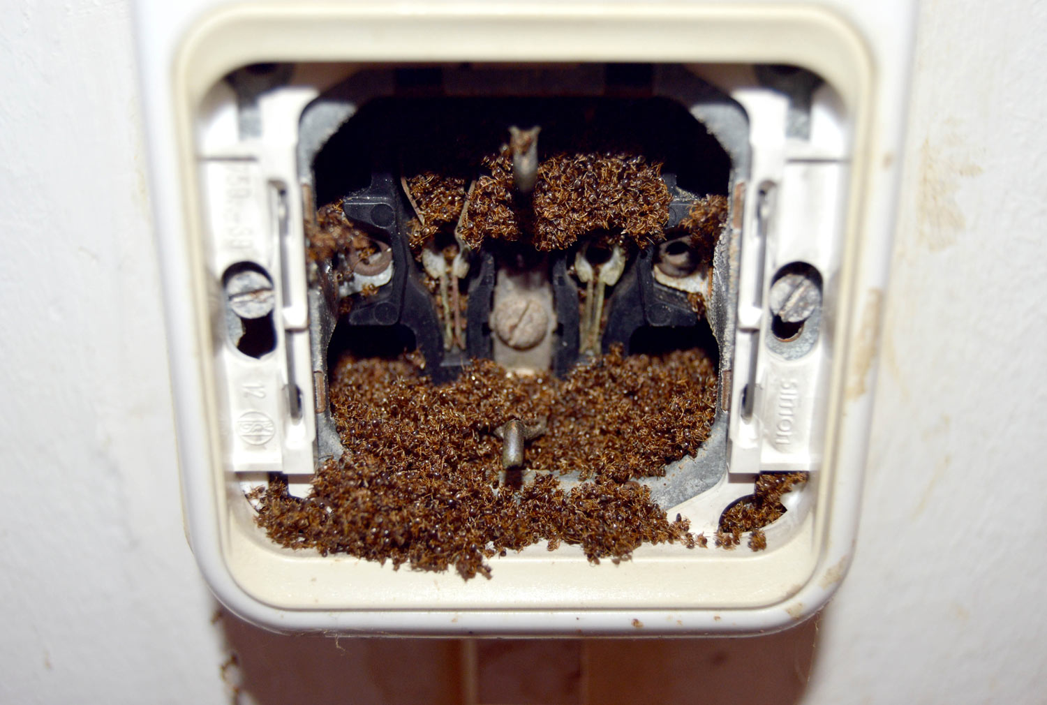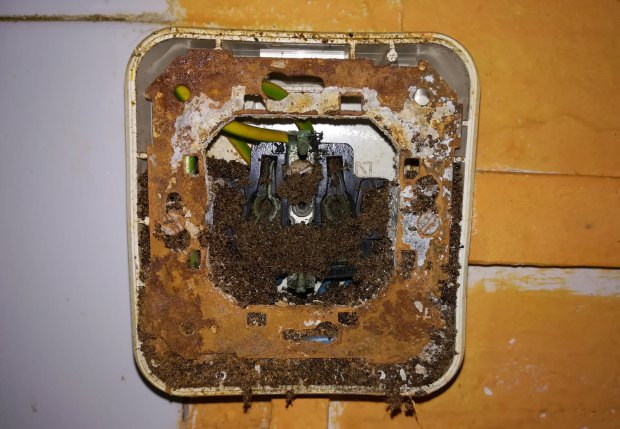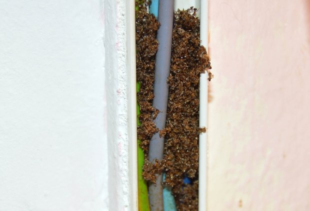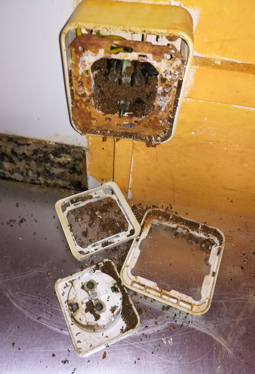 Ahora bien, el caso más interesante ha sido el de una vivienda con Lasius neglectus del que muestro detalle en la imágenes. Esta vivienda situada en la planta baja llevaba años padeciendo esta hormiga, pero no fue hasta este año en que la situación se volvió insoportable. Esta hormiga siente atracción por el cableado eléctrico donde las obreras muertas se van acumulando. Llega un momento en que el conjunto de cadáveres es tal que provoca cortocircuitos. Estas obreras muertas forman una masa esponjosa e higroscópica que, seguramente, cuando están húmedas hacen saltar la luz. Según entiendo, fuera de hacer saltar la luz, no existe el peligro de que provoquen un incendio. En el caso de que no saltara el conmutador diferencial del cuadro eléctrico por estar averiado, la electricidad fundiría los cuerpos de las hormigas. En fin, queda aquí constatada una problemática generada por hormigas en medio urbano que va más allá de la simple molestia.