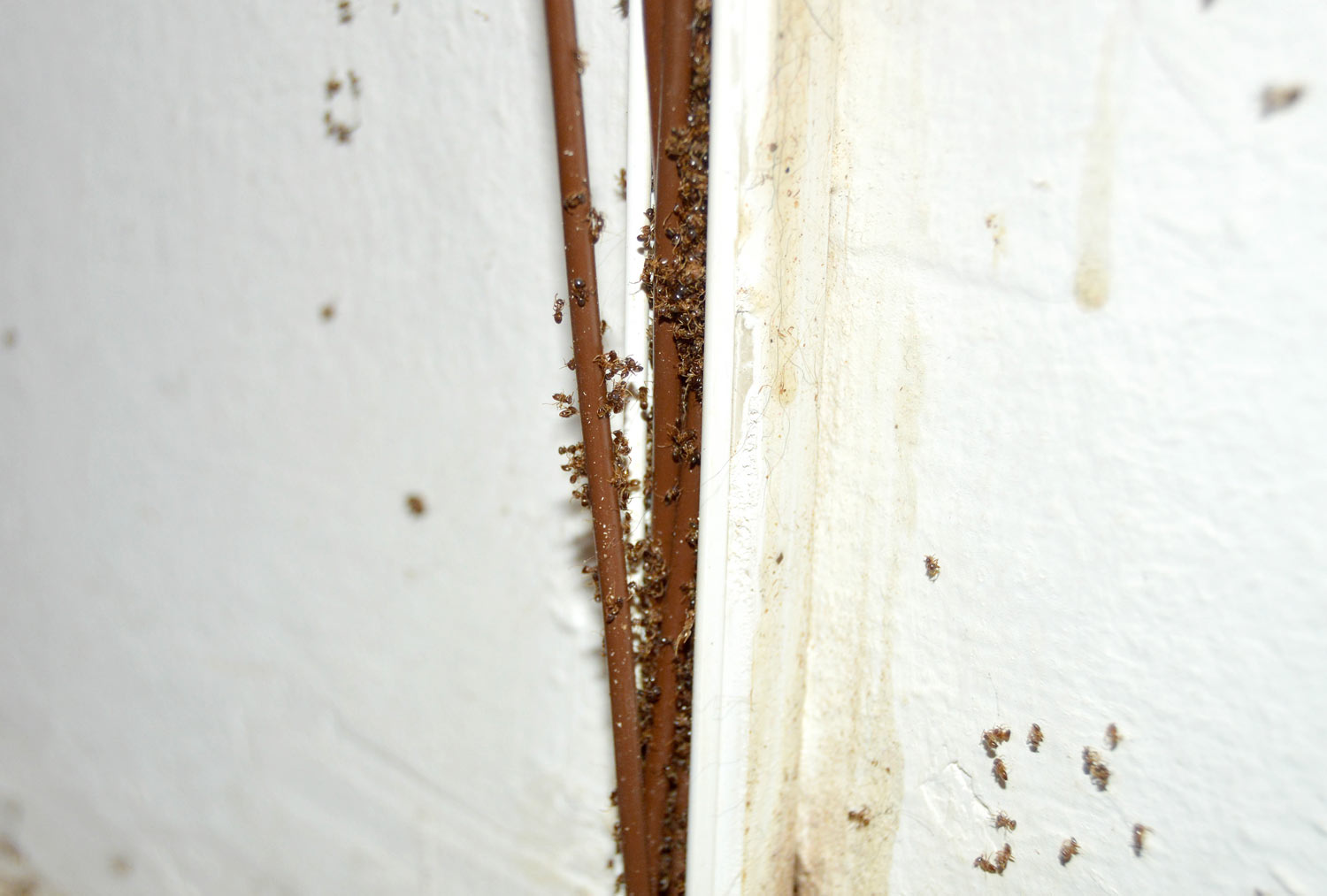 Fig 3. Acumulación de obreras muertas de Lasius neglectus detrás del cabecero del dormitorio./ C. Pradera 09-2019