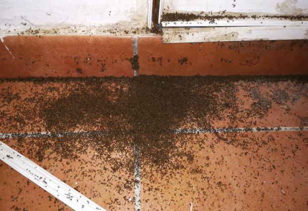 Fig 1. Acumulación de obreras muertas de Lasius neglectus detrás del cabecero de un dormitorio./ C. Pradera 09-2019
