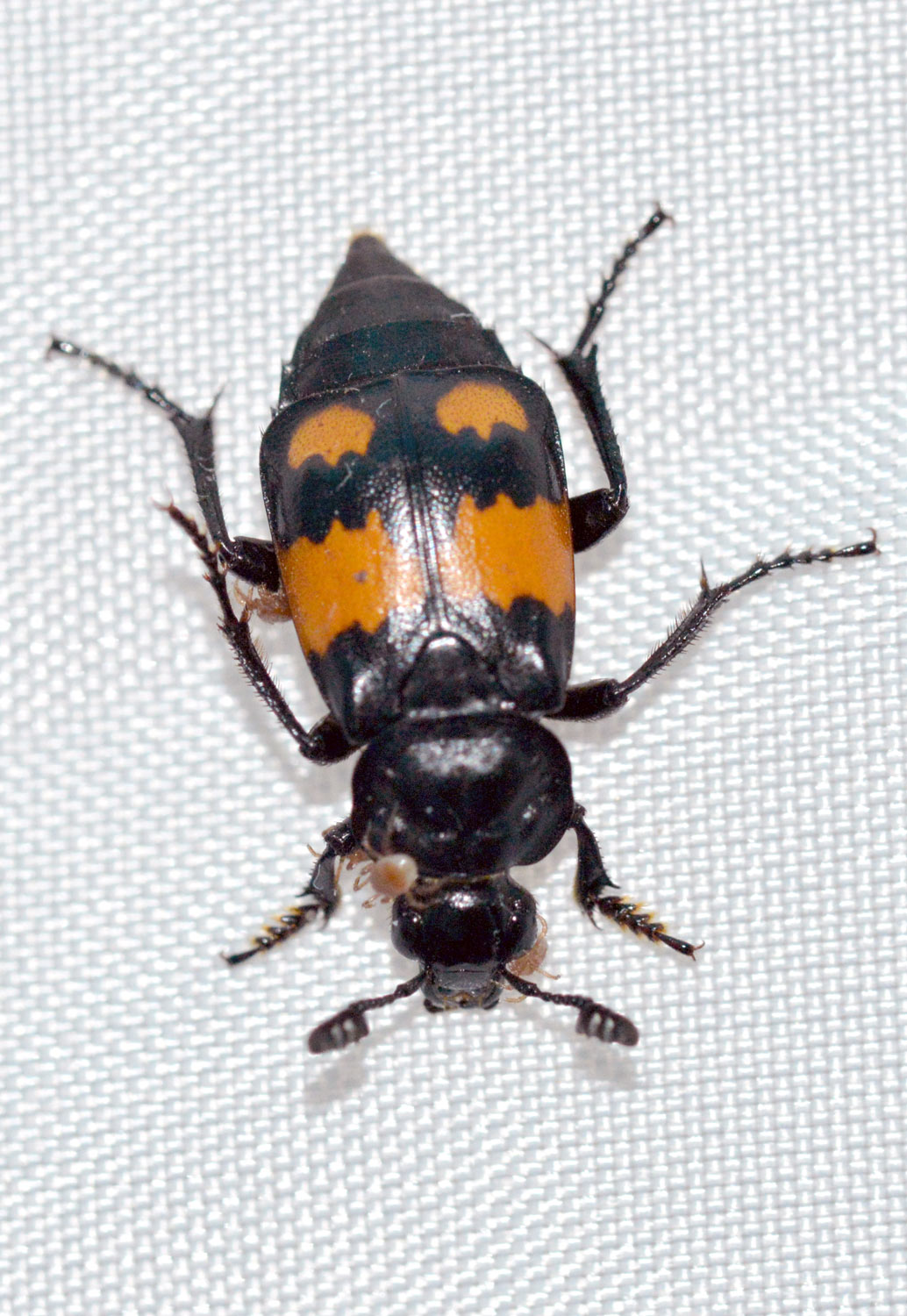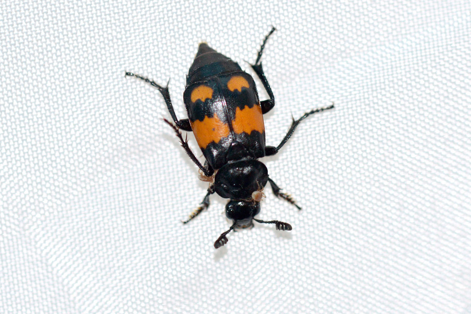 Estando en Ribadesella, Asturias, recibí la grata sorpresa de un visitante inesperado. Estaba en la tienda de campaña, cuando oí un revoloteo. Algo aterrizó sobre la lona. Ante mis ojos apareció un hermoso necrófago con manchas de color calabaza (figura 1). Entonces vi que sobre su cuerpo correteaban ácaros. Parecían buscar una mejor posición e iban del dorso al vientre y de arriba a abajo. Saqué la cámara y tomé unas imágenes. Además de fotografiar al hermoso individuo, enfoqué hacia los ácaros. Luego, los metí a todos en un frasco. Después me olí los dedos con los que había tocado el escarabajo. Hedía claramente a cadáver.