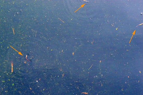 A finales de julio, visité una granja situada en el término municipal de Vilademuls, en la comarca de Pla de l’Estany, Girona. Esta granja tiene una antigua fosa de estiércol que se encuentra en desuso (figura 1). Vi que había agua acumulada. Entonces, me acerqué un momento para ver si había algo que despertara mi interés. Y en efecto, encontré unas larvas alargadas que nadaban sobre la superficie del agua (figuras 2 y 3). No sabía de qué se trataba. Quería observarlas de cerca, pero había un obstáculo. El nivel del agua estaba bajo, a unos dos metros desde el borde del muro que rodeaba la fosa. Entonces improvisé un utensilio con el aplicador de aerosoles Gotcha Pro. En el extremo de la pértiga amarré un bote de plástico, lo cual resultó en una especie de dipper o cucharón para recolectar larvas de mosquito (figuras 4 y 5).