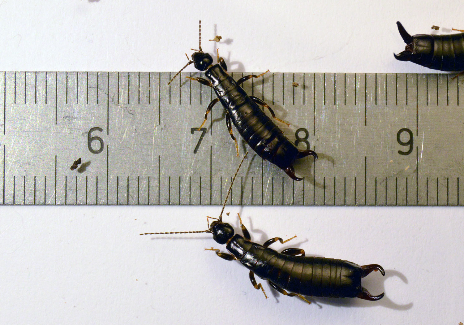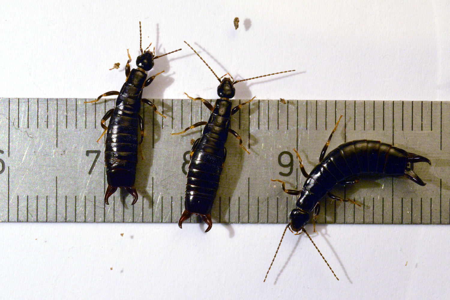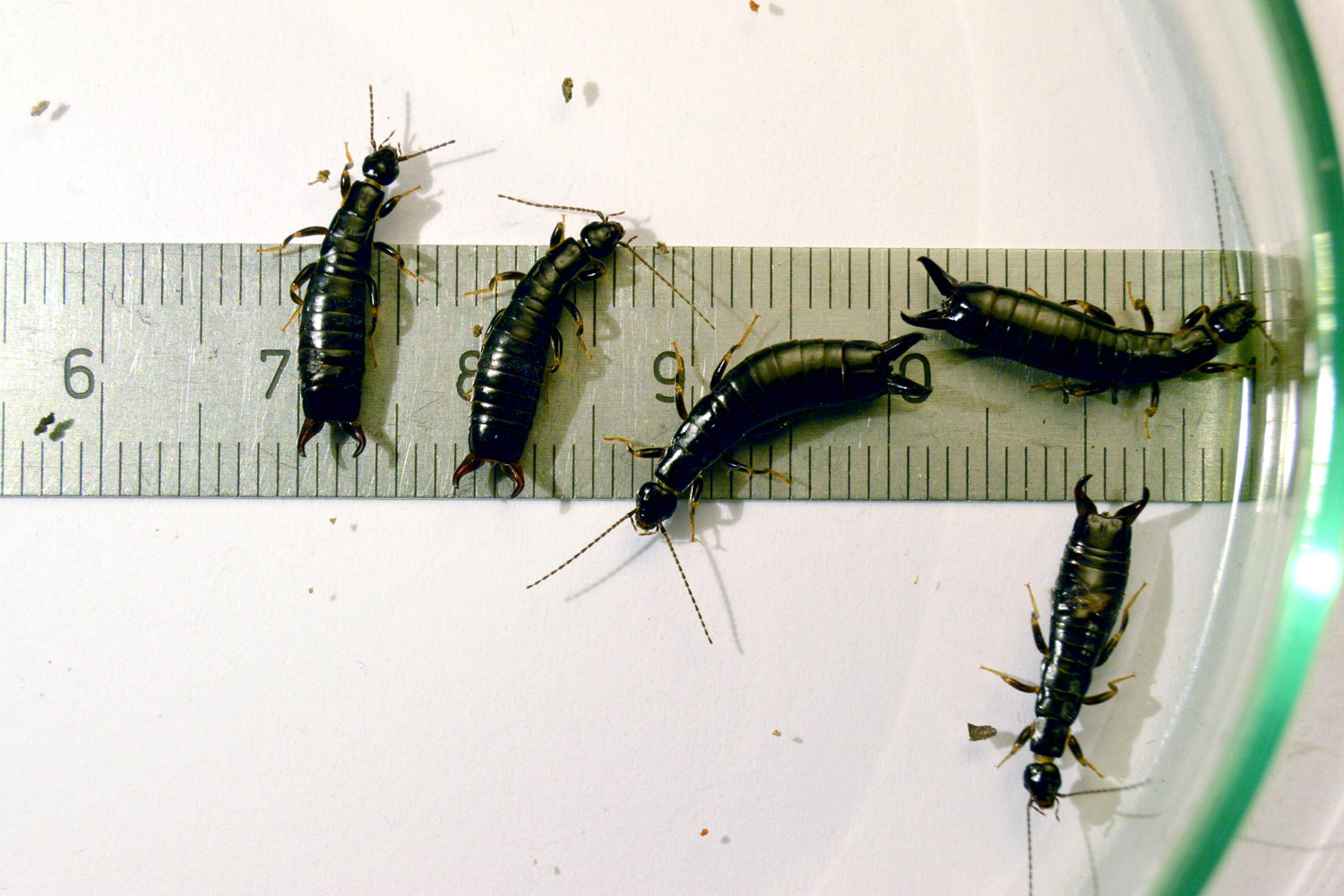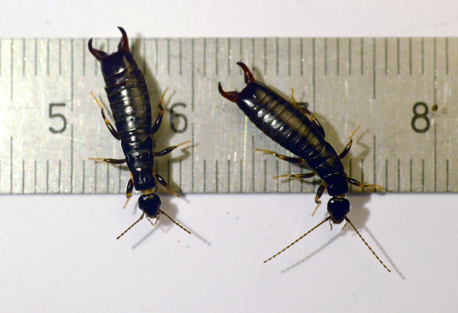 La semana pasada encontré tijeretas de la especie Euborellia moesta en una granja de Parlavà, Baix Empordà, Girona. Al acabar de realizar el servicio de desratización, vi un plástico negro sobre el suelo. Se encontraban junto a los silos de forraje. De hecho, es el plástico que cubre el forraje y se va retirando a medida que se gasta. Al levantarlo, pude ver interesante vida y unas cuantas tijeretas. Había mucha humedad bajo el plástico, ideal para estas tijeretas. Me entretuve en dar caza a unas cuantas. En total, recolecté 8 individuos, 5 machos y 3 hembras (figura 1). Como es sabido, los machos se distinguen de las hembras por la forma de los fórceps, un poco más robustos y con los extremos mirando hacia dentro.