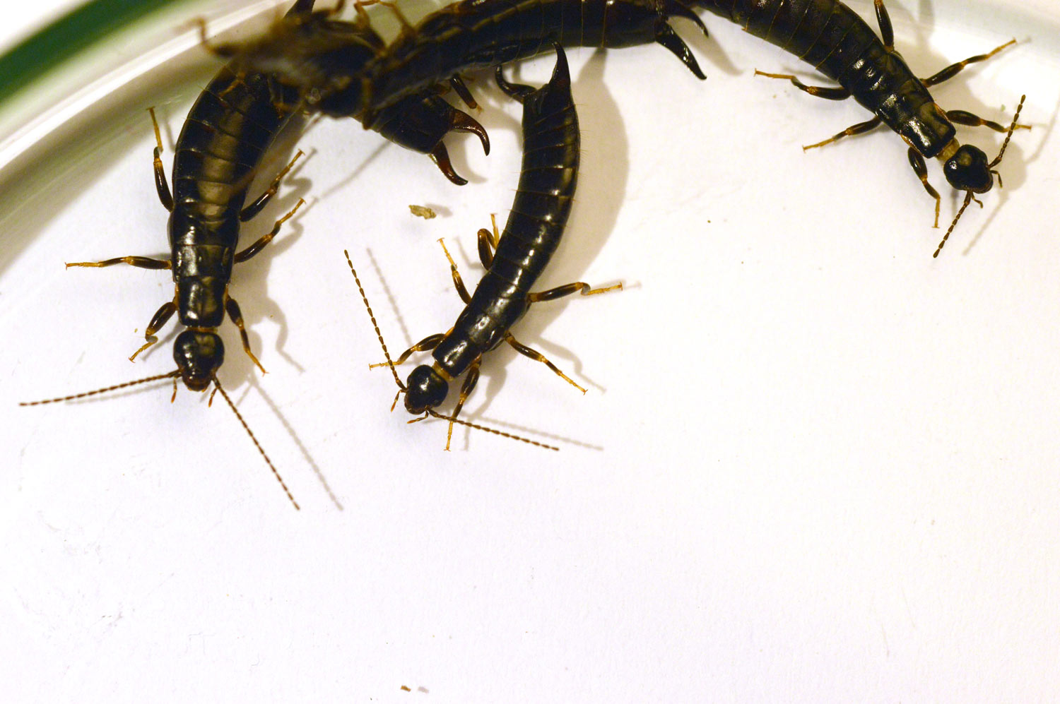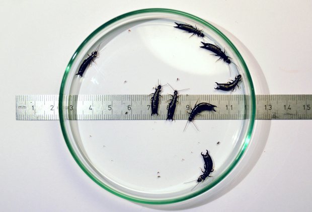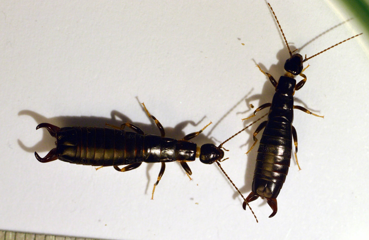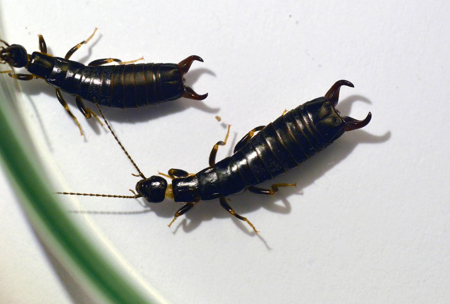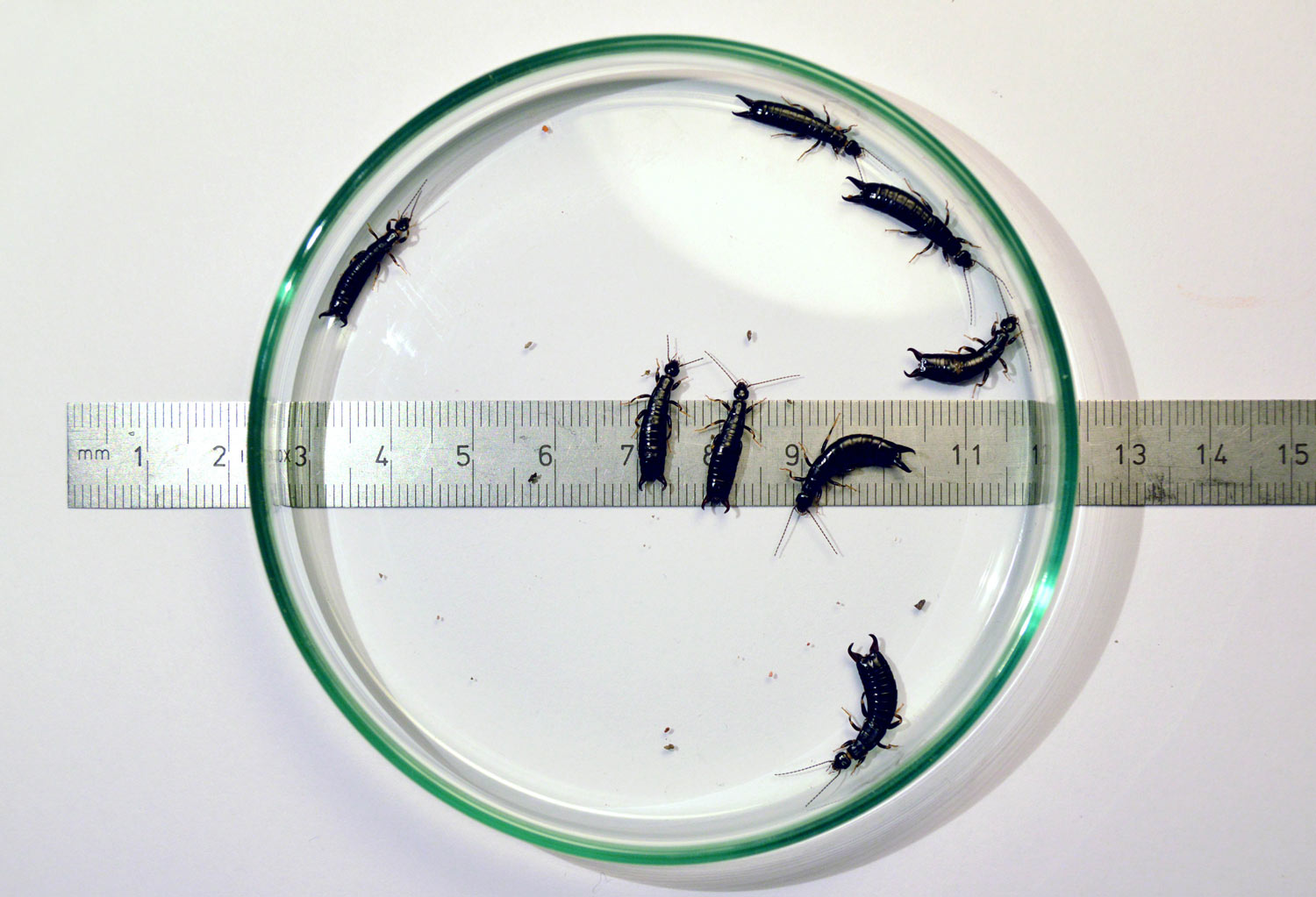La semana pasada encontré tijeretas de la especie Euborellia moesta en una granja de Parlavà, Baix Empordà, Girona. Al acabar de realizar el servicio de desratización, vi un plástico negro sobre el suelo. Se encontraban junto a los silos de forraje. De hecho, es el plástico que cubre el forraje y se va retirando a medida que se gasta. Al levantarlo, pude ver interesante vida y unas cuantas tijeretas. Había mucha humedad bajo el plástico, ideal para estas tijeretas. Me entretuve en dar caza a unas cuantas. En total, recolecté 8 individuos, 5 machos y 3 hembras (figura 1). Como es sabido, los machos se distinguen de las hembras por la forma de los fórceps, un poco más robustos y con los extremos mirando hacia dentro.