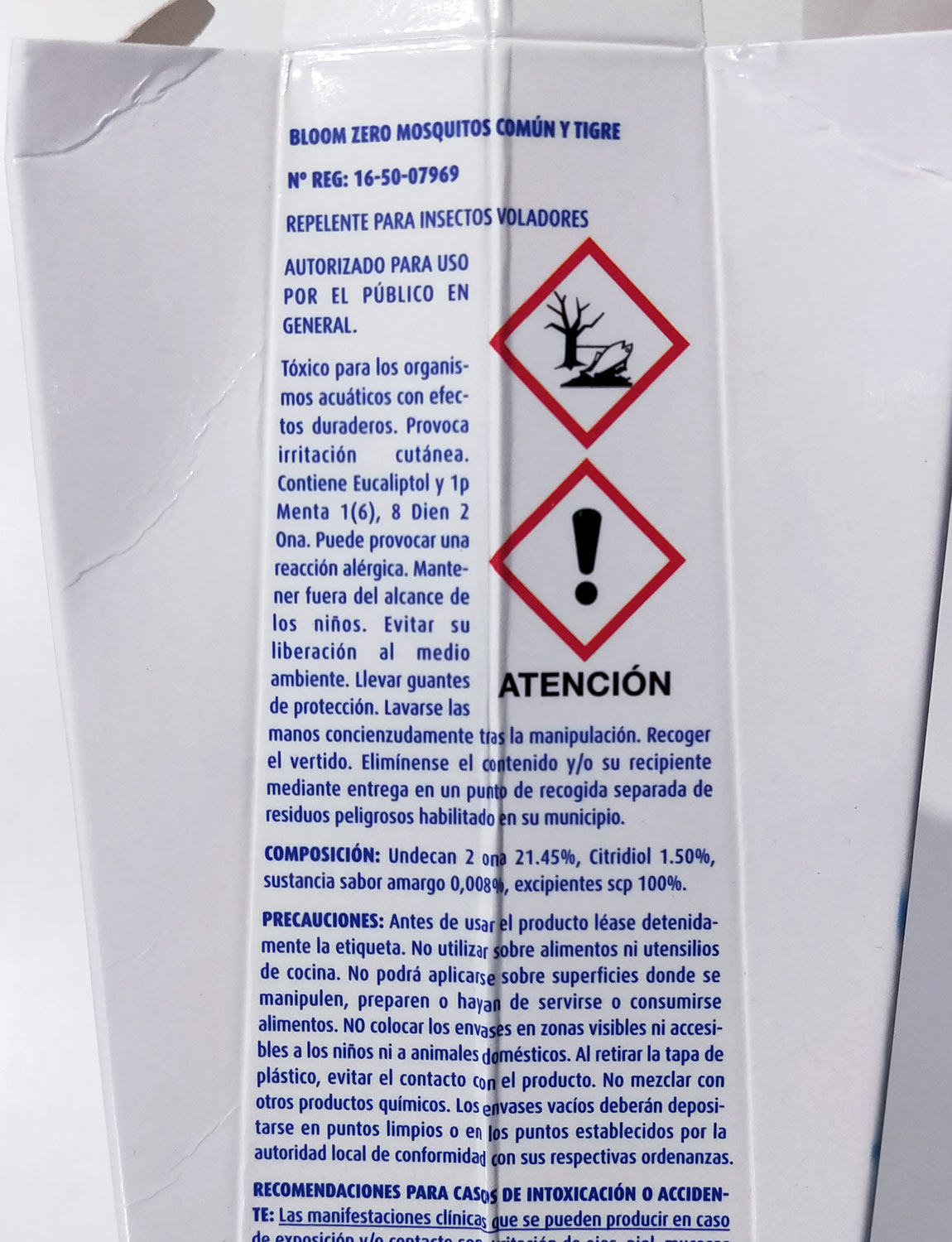 Bloom Zero tiene el número 16-50-07969 del Registro de Plaguicidas no Agrícolas del Ministerio de Sanidad. Su fórmula contiene dos materias activas repelentes: citridiol al 1’5 % y undecan-2-ona al 21.45 % (ver figura 3). El citridiol es un compuesto que se obtiene de las hojas del árbol Corymbia citriodora y es uno de los mejores repelentes de origen natural. La undecan-2-ona es también un compuesto de origen vegetal que se puede encontrar en una amplia variedad de plantas, pero su producción es por lo normal sintética.