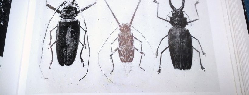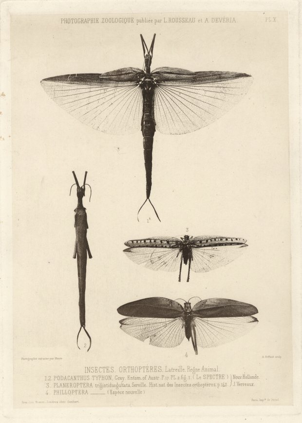 La primera fotografíaa es la que aparece en ‘Nouvelle Histoire de la Photographie’ de 1994 y consta como plancha III (figura 5). Están representadas tres especies de coleópteros longicornios: Macrodontia cervicornis, Enoplocerus armillatus y Acrocinus longimanus. Son tres cerambícidos de gran tamaño y belleza que están distribuidos en el centro y sur de América. La segunda fotografía consta en el libro como plancha X y aparecen representados tres ortópteros: Podacanthus typhon, Planeroptera trigintiduogultata y Philloptera (figura 6). La primera especie está distribuida en Australia. Y las otras dos, desconozco a qué especies se refiere. De hecho, junto al nombre de género de la última se puede leer: «Espèce nouvelle».