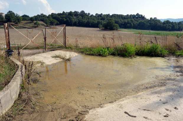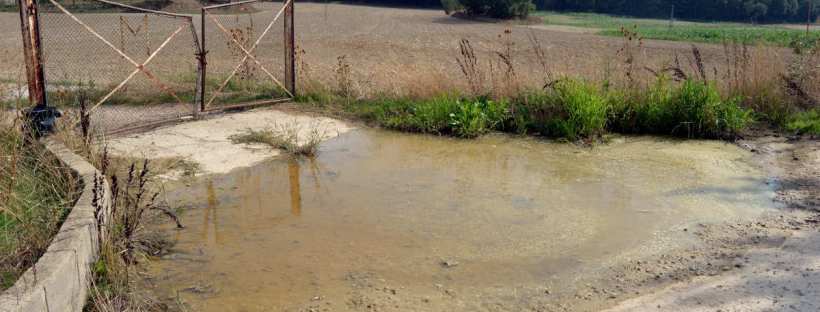 En la imagen número 1, se puede ver la entrada a una vieja granja porcina en desuso. En este tipo de instalaciones de ganadería, suele haber a la entrada una balsa de desinfección que consiste en una depresión en el terreno donde se vierte desinfectante. Con esto se busca la desinfección de los vehículos por motivos de bioseguridad. Es fácil arrastrar bacterias y otros patógenos de una granja a otra, por lo que el acceso de vehículos, maquinaria y personas se ha de realizar acorde con unos protocolos de desinfección.