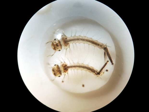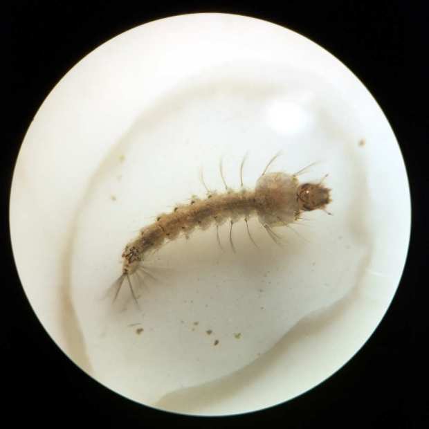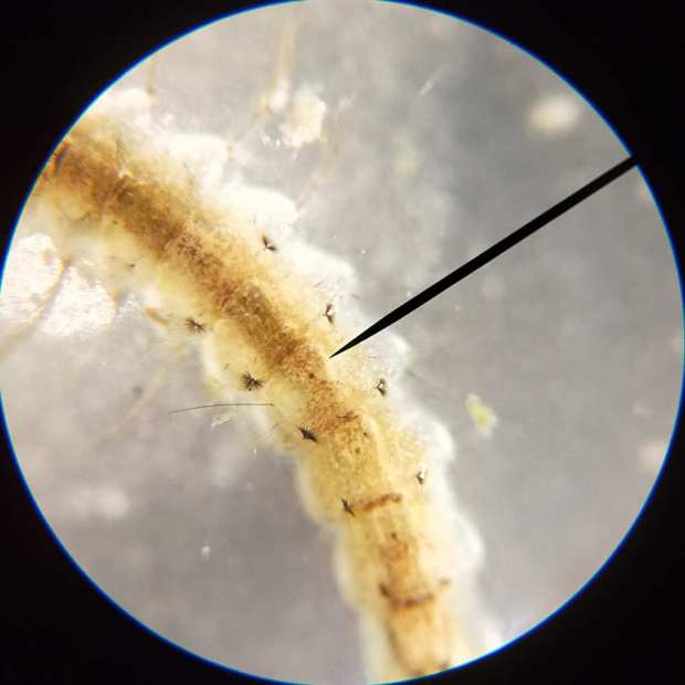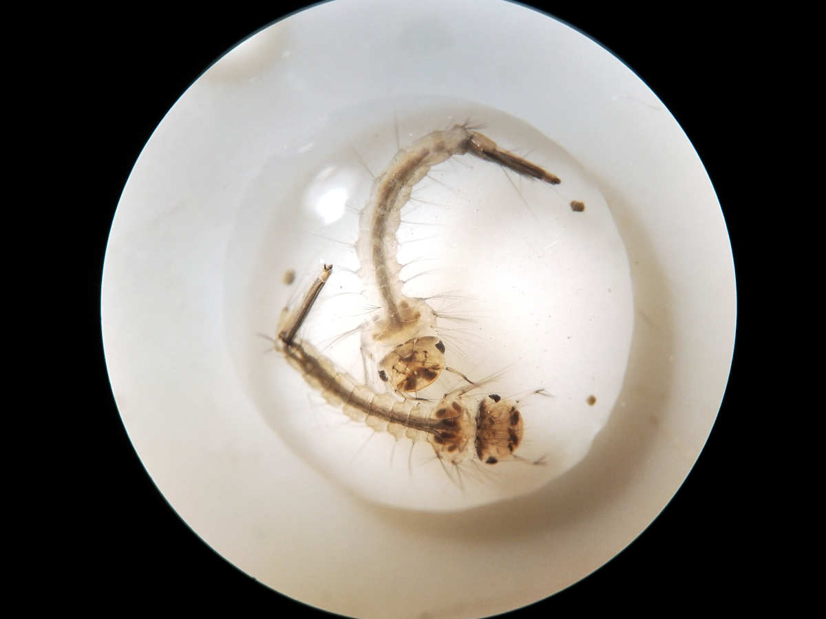 Pues bien, en esta balsa de desinfección el agua de lluvia permite el desarrollo de larvas de mosquito entre otros artrópodos (figura 2). Lo bueno del caso es que también se ha acumulado barro y han crecido algunas plantas. Todo ello ha permitido que concurran hasta cuatro especies de mosquito que tienen una biología bastante diferente. El pasado mes de octubre, a principios de mes, recogí larvas que me llevé a casa. Las dispuse en un eclosionador a la espera de que emergieran los adultos (figura 3). Ahora bien, lo primero que hice fue la identificación de las larvas. Y encontré que había tres especies. Por orden de abundancia, lo primero que encontré fueron larvas de Aedes vexans y luego de Aedes caspius. Y también un par de larvas de Anopheles maculipennis s.l. Ahora bien, tres semanas después volví a pasar por la granja para recoger más muestras. Y entonces encontré que había básicamente larvas de Culex pipiens.