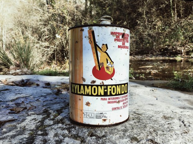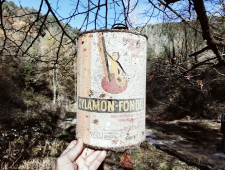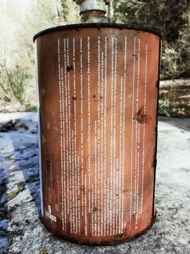 Ayer descubrí la Riera de Sorreigs, un curso de agua que atraviesa las comarcas del Lluçanès y de Osona. Nace en Sant Boi de Lluçanès y finaliza en Santa Cecília de Voltregà donde desagua en el río Ter. Atraviesa territorio de gran belleza e interés natural. En un meandro de la riera, en el término municipal de Sobremunt, encontré un viejo molino de harina abandonado (figura 1). Tenía parte del tejado caído. Unos 100 metros más arriba había una pequeña presa para embalsar el agua y desviarla por una acequia hasta el molino. Accedí al interior para disfrutar de esta joya secular. El interior estaba en muy mal estado. Vigas de madera caídas. Y justo sobre una repisa encontré una vieja lata de Xylamon Fondo (figura 2).
