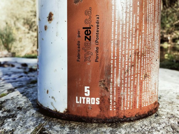 En las imágenes 6 a 10 se puede ver detalles de la lata que encontré. Tiene capacidad para 5 litros y mide 24 cm de alto por 17 de diámetro. En la lata pone que el fabricante es Xylazel SA, lo cual indica que es posterior a 1975. Sin embargo, no sabría decir de cuándo es exactamente. Hay que indicar que no tiene código de barras, innovación que llegó a España a finales de la década de 1970. Así pues, situaría la lata a principios de la década de 1980. Un aspecto a destacar es el hecho de que los productos protectores de la madera carecían de número de registro sanitario. Esto se debe a que hasta mediados de la década de 1990, este tipo de productos se consideraban de uso industrial y estaban bajo el control del Ministerio de Agricultura. Durante muchos años, los protectores de la madera eran controlados por el Instituto Forestal de Investigaciones y Experiencias dependiente de la Dirección general de Montes, Caza y Pesca Fluvial del dicho Ministerio.