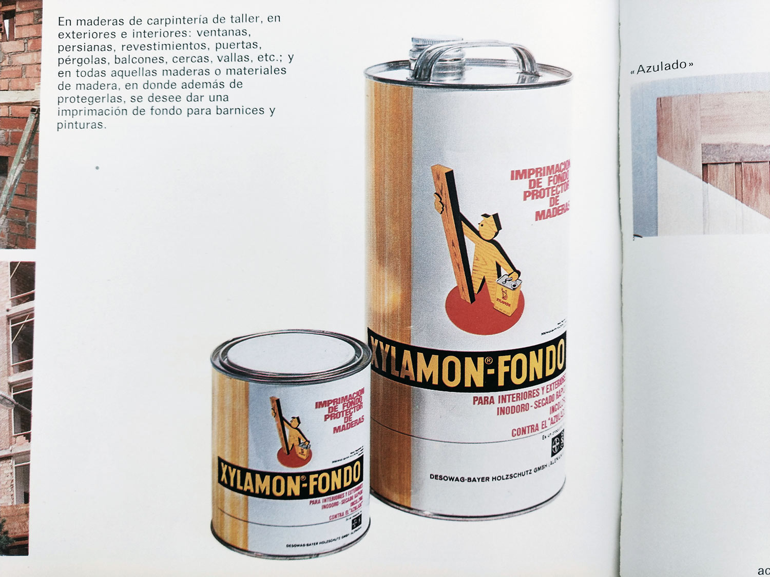 Xylamon Fondo es un producto creado por Desowag-Bayer que todavía hoy en día se sigue comercializando bajo Akzo Nobel, la propietaria actual de la marca. Aparece en un catálogo de productos de la madera de 1975 de Zeltia Agraria (figuras 3 a 5) [3]. El producto es descrito así: «Protector de maderas oleoso a base de resinas alkídicas, listo para el empleo (según DIN 68800), que a la vez de proteger la madera, le da una eficaz imprimación de fondo, con buen llenado de poros, para aplicar encima toda clase de barnices o pinturas. Se presenta incoloro y pigmentado en blanco». Estaba destinado a la protección preventiva contra los hongos de pudrición, del azulado y contra los insectos xilófagos. Tal y como se puede ver en la imagen del catálogo, el producto era para utilizar «en maderas de carpintería de taller, en exteriores e interiores». Podía ser aplicado mediante pincelado, pulverización o inmersión. La dosis era de 70-100 g/m2 para su uso como imprimación y 200 g/m2 cuando se utilizara como protector de maderas.
