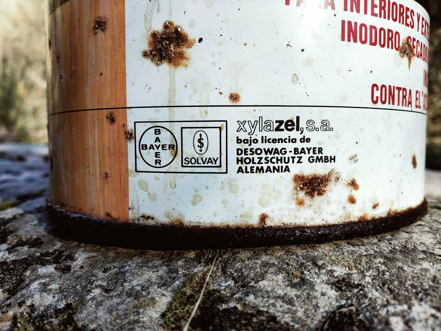 Limpié la lata para poder leer el contenido de la etiqueta y disfrutar del descubrimiento. Hace cuatro años, dediqué una entrada a la historia de la marca Xylamon [1]. Este protector de la madera fue comercializado hacia 1923 en Alemania. De gran éxito contra la carcoma, pasó a manos de Solvay. A principios de la década de 1960 Bayer y Solvay empezaron a colaborar en el desarrollo de productos para la protección de la madera. De esta asociación nació en 1968 Desowag-Bayer Holzschutz GmbH. Hasta este año aproximadamente, los productos de la gama Xylamon eran distribuidos en España por Solvay y fabricados por Desowag Chemie Gesellschaft Chaft MBH de Düsseldorf, que era filial de la primera [2]. Posteriormente, los productos pasaron a ser distribuidos por Zeltia Agraria SA. Y en 1975, Zeltia se unió a Desowag-Bayer para fundar Xylazel SA para la fabricación en España de los protectores, además de su distribución.