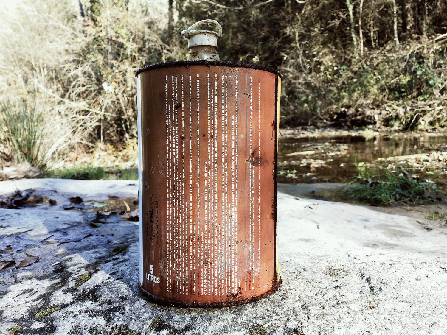 Ayer descubrí la Riera de Sorreigs, un curso de agua que atraviesa las comarcas del Lluçanès y de Osona. Nace en Sant Boi de Lluçanès y finaliza en Santa Cecília de Voltregà donde desagua en el río Ter. Atraviesa territorio de gran belleza e interés natural. En un meandro de la riera, en el término municipal de Sobremunt, encontré un viejo molino de harina abandonado (figura 1). Tenía parte del tejado caído. Unos 100 metros más arriba había una pequeña presa para embalsar el agua y desviarla por una acequia hasta el molino. Accedí al interior para disfrutar de esta joya secular. El interior estaba en muy mal estado. Vigas de madera caídas. Y justo sobre una repisa encontré una vieja lata de Xylamon Fondo (figura 2).