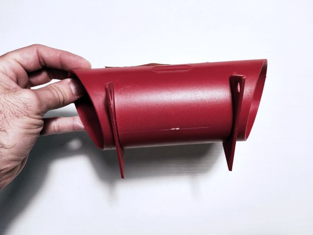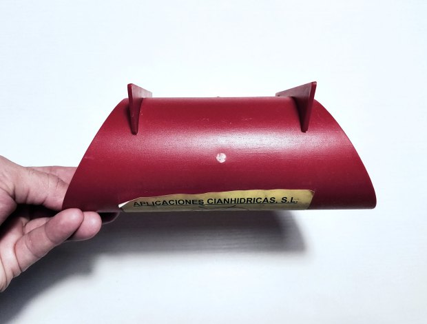 Este portacebos es una versión industrial del tubo de policloruro de vinilo (PVC) con marquetería que algunas empresas del sector se fabricaban desde la década de 1980 [3]. El uso de un trozo de tubo como portacebos ha sido muy utilizado desde siempre para proteger el rodenticida de la intemperie y también una manera de evitar que estuviera al alcance de niños y animales domésticos. He visto portacebos tubulares fabricados con materiales como hierro, fibrocemento (uralita) o plástico. Ahora bien, el uso generalizado del PVC para la construcción a finales de la década de 1970 puso en el mercado un material barato y dúctil. Ello permitió practicar una ranura en cada extremo donde insertar una tablilla de madera o del mismo material plástico. Con ello se daba estabilidad al tubo y permitía proteger el cebo de la intemperie y evitar que estuviera al alcance de niños y animales domésticos. Conocidos son los portacebos de ECOPLAG que se encontraban en las estaciones de RENFE hasta hace pocos años.