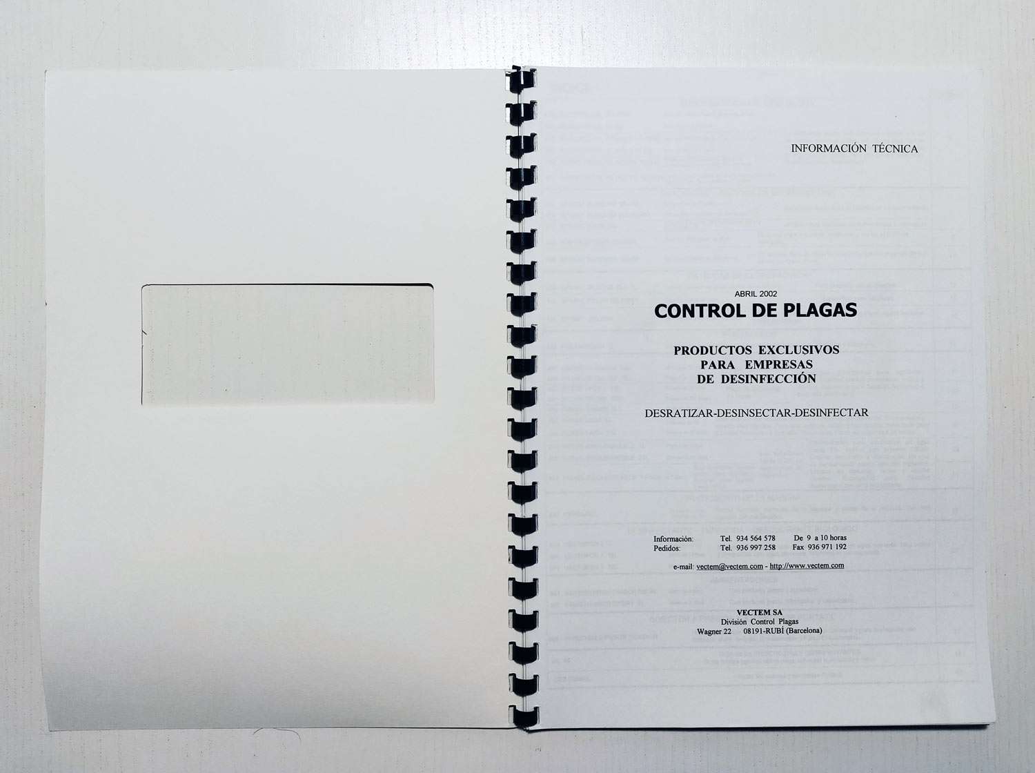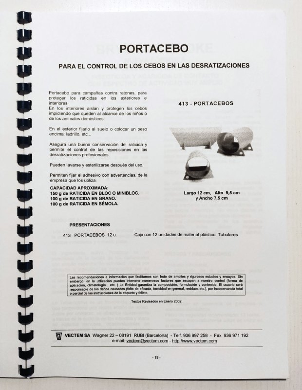 Desconozco cuándo la compañía VECTEM SA de Rubí (Barcelona) incorporó en su catálogo el portacebos tipo túnel que aparece en las imágenes. Figura en un catálogo que tengo de abril de 2002 como único modelo de portacebos disponible (figuras 3 y 4). Esta compañía tuvo una línea de productos para control de plagas desde principios de la década de 1980 hasta finales de la década de 2000 con una fuerte implantación en Cataluña [1]. VECTEM fue una empresa reconocida que operaba con un línea propia de productos biocidas para la desinfección, desinsectación y desratización.