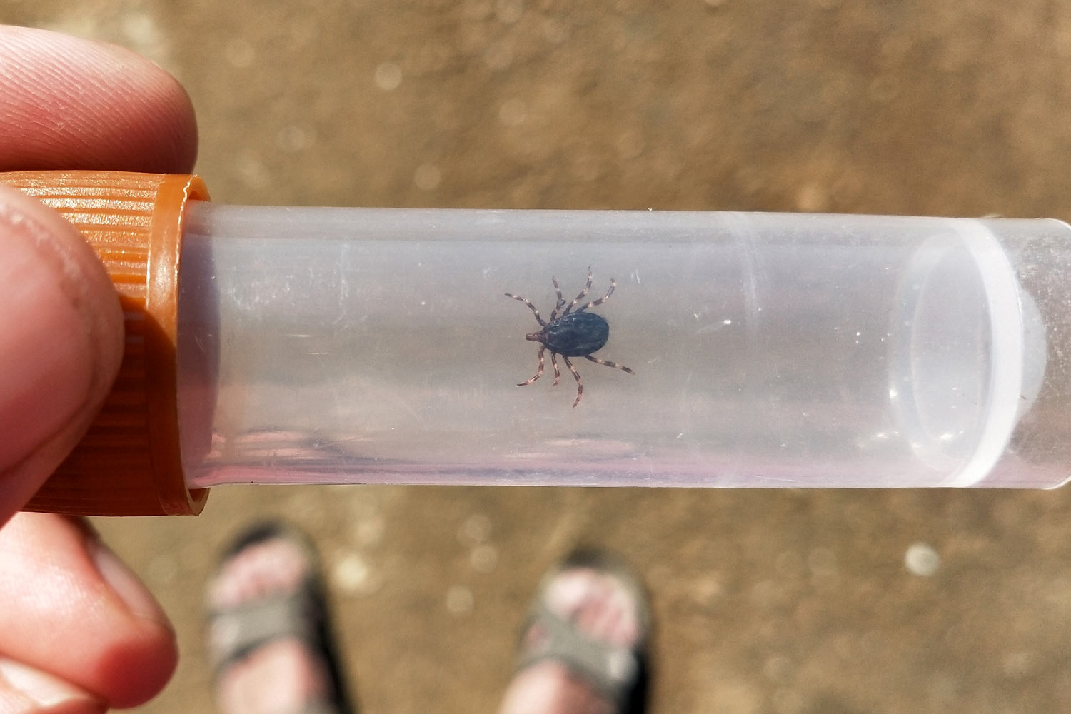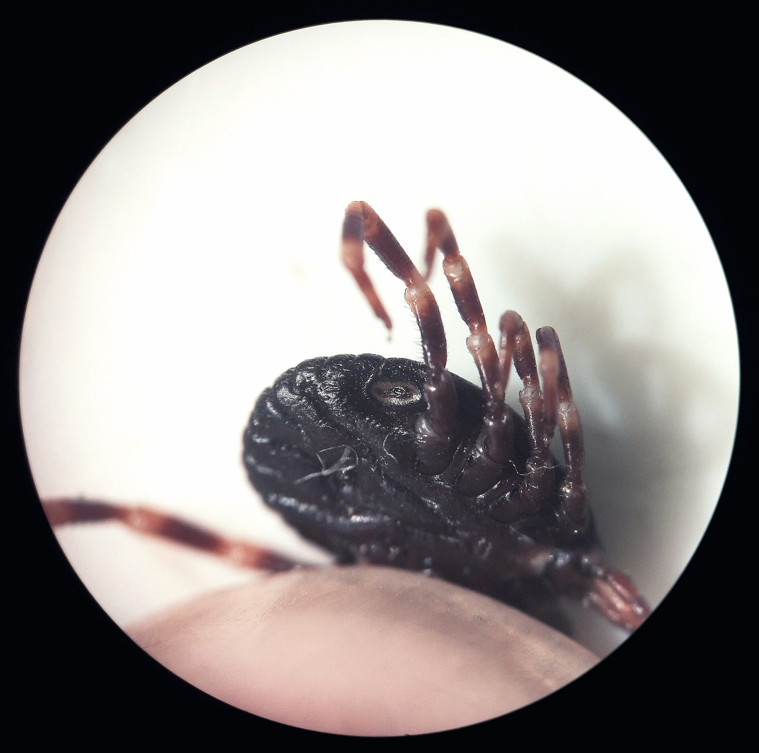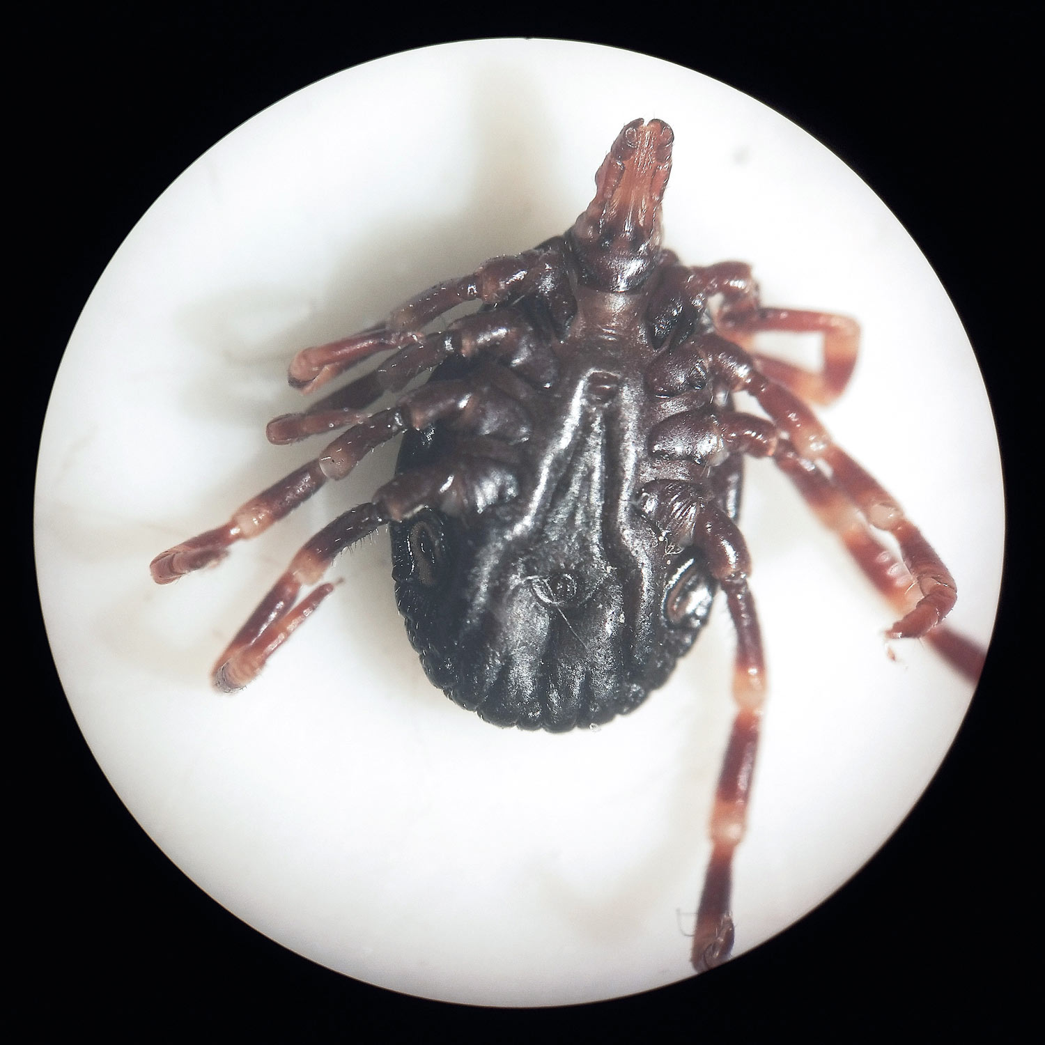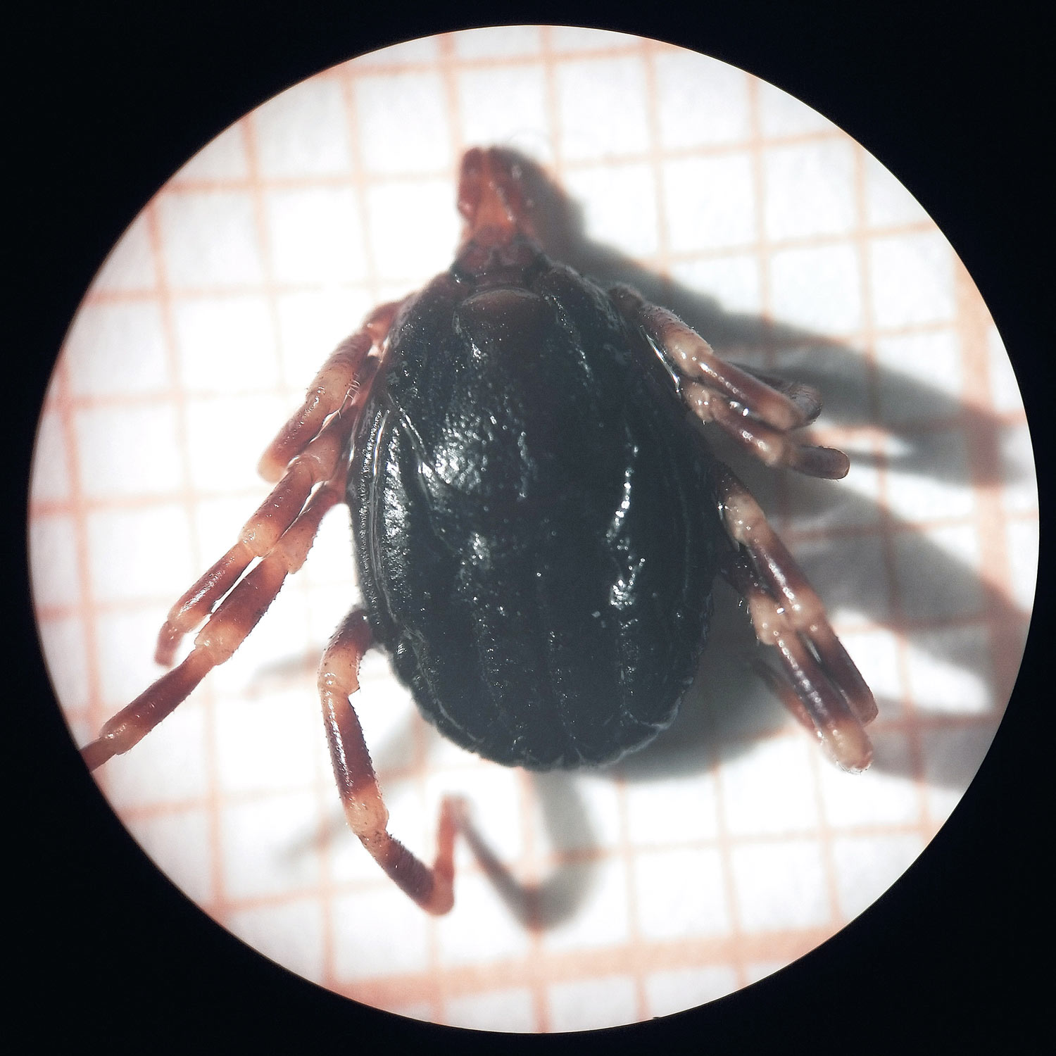 Por suerte, no encontré ninguna garrapata más, aunque no me quedé tranquilo. Y más pensando en que a mi mujer le había picado una del género Hyalomma que, como bien sabemos, es el transmisor más eficiente del virus que provoca la fiebre hemorrágica Crimea-Congo (FHCC) [1]. Se trata de una de las enfermedades trasmitidas por garrapatas que tiene mayor extensión a nivel mundial. Al ver en detalle la garrapata (figuras 3 y 4), me pareció mayor que las Hyalomma que encuentro a menudo durante la primavera y verano cerca de mi casa en la Serralada de Marina, en Santa Coloma de Gramenet, Barcelona [2]. Hasta donde puedo llegar, las garrapatas que encuentro en la Serralada de Marina serían Hyalomma lusitanicum, diferentes de la hembra del Ebro que podría tratarse de la especie H. marginatum, la cual está ampliamente distribuida por la cuenca del Mediterráneo y juega un papel fundamental en la transmisión de la enfermedad [1].