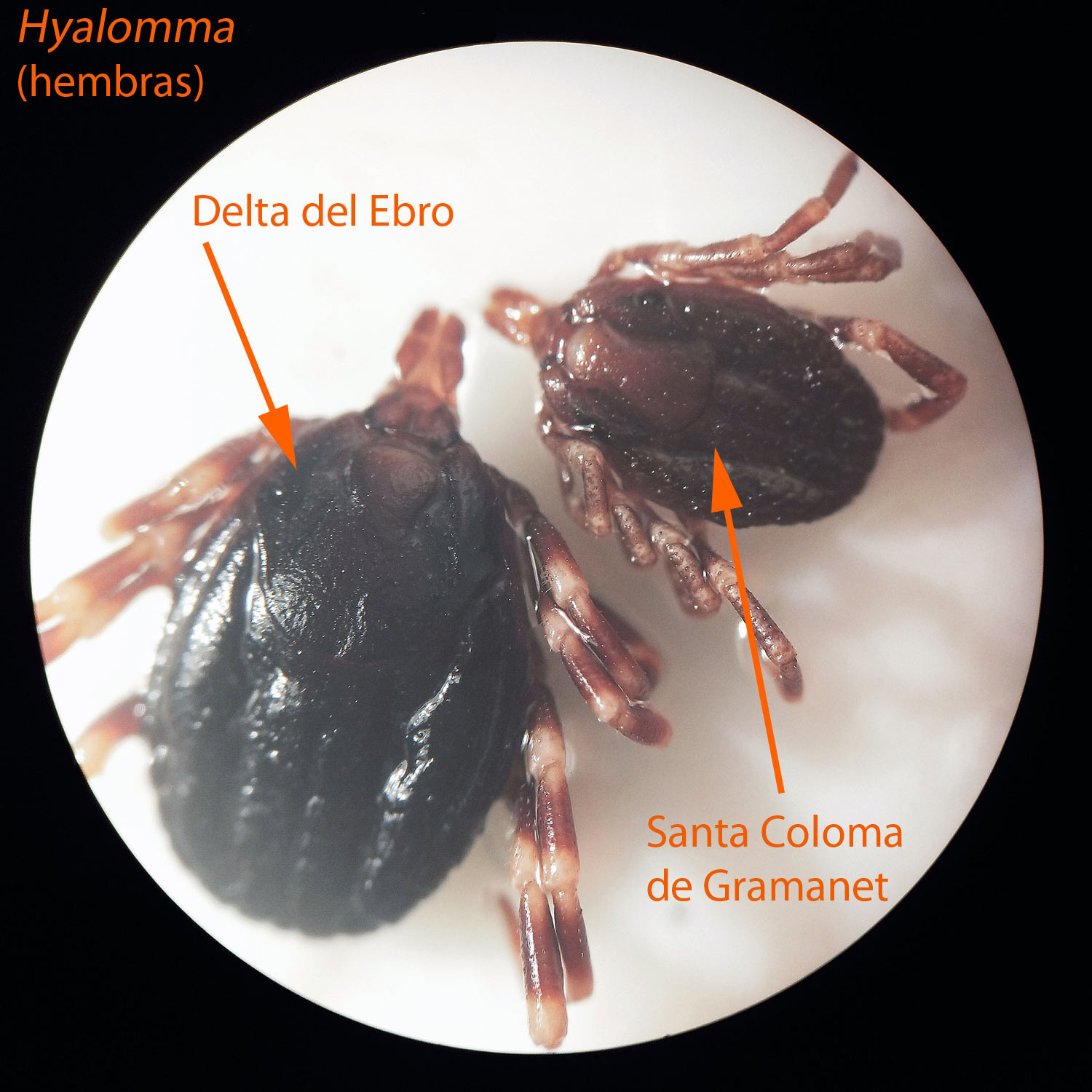 Al regresar a casa estuve observando en detalle la garrapata encontrada en el Delta del Ebro y la comparé con individuos recolectados de la Serralada de Marina [2]. Intenté ayudarme con el libro del experto Agustín Estrada-Peña sobre las garrapatas de Europa y Norte de África [3]. Pero no acababa de estar seguro de que el individuo encontrado  en el Ebro fuera H. marginatum. Así que lo dejé estar un tiempo hasta hace poco cuando tuve la suerte de entrar en contacto con Agustín Estrada-Peña. Le mandé imágenes de la hembra recolectada en el Ebro y de otra de Santa Coloma de Gramenet. Me respondió que la del Ebro era H. marginatum y que la de Santa Coloma todo apuntaba a H. lusitanicum.