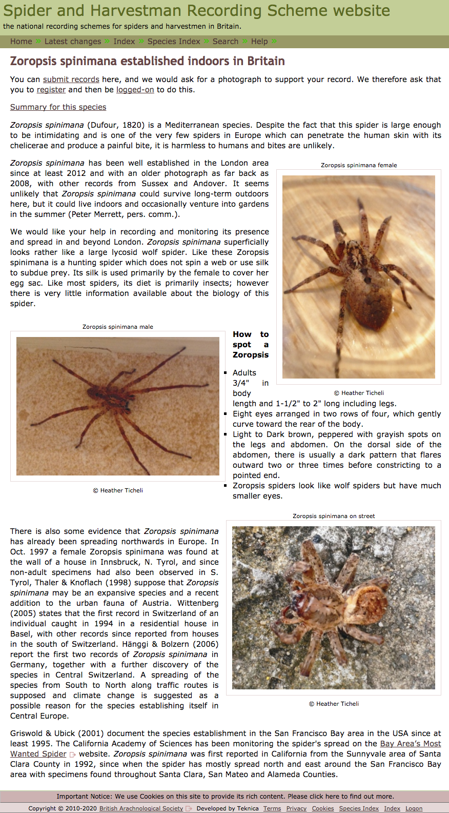[3] British Arachnological Society. Zoropsis spinimana established indoors in Britain. En: srs.britishspiders.org.uk. Consulta: 09-01-2020 (artículo reproducido en figura 16).