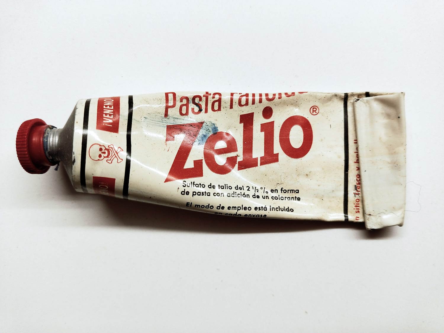 Zelio estaba formulado con sulfato de talio al 2’5%. La pasta iba teñida con un colorante azul que debía manchar bastante para hacerlo visible en el caso de dejar tintados los dedos. Ahora bien, este compuesto tiene una DL50 oral en ratas de 15-50 mg/kg y en personas de 10-15 mg/kg, lo cual significa que es muy tóxico. Si tenemos en cuenta que el tubo de Zelio es de 30 gramos de producto, deducimos que contiene 750 miligramos de sulfato de talio. Y esto es una cantidad considerable que permite matar muchas ratas y también a una persona, ya que se estima que un adulto necesita unos 800 miligramos. Hay que apuntar que el sulfato de talio es una sustancia que fue muy utilizada para perpetrar asesinatos. Tiene una crónica negra importante. Por poner un ejemplo, se dice que fue muy utilizado por el KGB en Rusia y por los servicios secretos de Sadam Hussein. Este uso tuvo su reflejo en novela negra o policíaca.