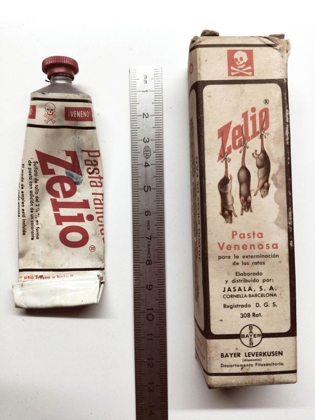 El tiempo no corre, sino vuela. En 2014 dediqué una entrada al raticida Zelio de Bayer [1]. Y ya estamos en enero de 2020. Entonces escribí sobre Zelio a partir de una búsqueda documental. Me interesaba este producto porque es el único, según creo, que fue comercializado a base de sulfato de talio (Tl2SO4). Otra cosa es que en la época se dispensara sulfato de talio en una droguería para fabricación propia de cebos raticidas. Como explicaba en aquella entrada, a principios de la década de 1920 Bayer patentó el uso de compuestos de talio contra múridos. Y al poco, comercializó el raticida Zelio, el cual tuvo una amplia difusión. Se vendió prácticamente en toda Europa y en América. En España se vendió como muy tarde desde 1927, según un anuncio que encontré [2]. Zelio fue formulado en pasta para ratas y en grano para ratones.